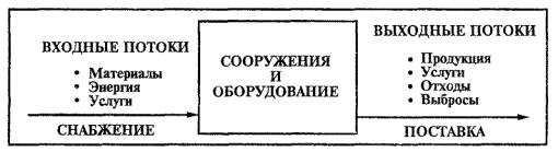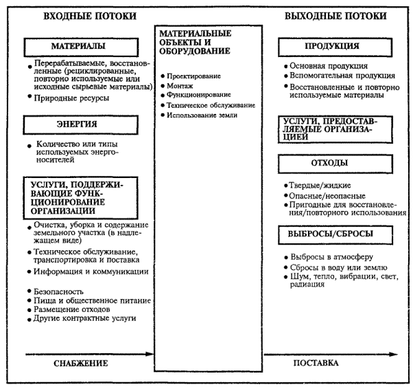 Рисунок А.1 - Схема функционирования организации (с дополнительными деталями) А.4.3.2.3 Услуги, поддерживающие функционирование организации Если экологическая эффективность связана с услугами, поддерживающими функционирование организации, то используют следующие ПЭФ: - количество опасных материалов, используемых в предлагаемых контрактных услугах; - количество очищающих компонентов, используемых в предлагаемых контрактных услугах; - количество рециклируемых или повторно используемых материалов, применяемых в предлагаемых контрактных услугах; - количество типов отходов, производимых в предлагаемых контрактных услугах. А.4.3.2.4 Материальные объекты и оборудование Если экологическая эффективность связана с материальными объектами организации и оборудованием, то используют следующие ПЭФ: - число элементов оборудования с составными частями, спроектированными с учетом простоты разборки, рециклинга и повторного использования; - число часов работы определенного оборудования в год; - число аварийных ситуаций (например взрывов) или нештатных ситуаций (например отказов оборудования) в год; - общая земельная площадь, используемая для целей производства; - земельная площадь, используемая для производства единицы энергии; - средний расход топлива на единицу пробега транспортного средства; - число транспортных средств, оснащенных технологическими устройствами очистки выхлопов; - число часов превентивного технического обслуживания оборудования за год. А.4.3.2.5 Снабжение и поставка Если экологическая эффективность связана с входными потоками (снабжение) и выходными потоками (поставка) в результате функционирования организации, то используют следующие ПЭФ: - средний расход топлива парком транспортных средств; - число грузовых перевозок транспортными средствами в день; - количество транспортных средств в парке, оборудованных технологическими устройствами для снижения вредных выбросов; - число деловых поездок, сокращенных за счет использования других средств коммуникаций; - число деловых поездок с использованием транспортных средств. А.4.3.2.6 Продукция Если экологическая эффективность связана с основной или вспомогательной продукцией (например материалы, не относящиеся к основной продукции, включая восстановленные или повторно используемые материалы, которые получают и сохраняют для дальнейшего использования в коммерческих целях), то используют следующие ПЭФ: - число изделий, выпущенных на рынок с пониженными опасными свойствами; - число изделий, которые могут быть повторно использованы или восстановлены; - процентная доля продукции, которая может быть повторно использована или восстановлена; - уровень брака в продукции; - количество вспомогательной (попутной) продукции, приходящейся на единицу основной продукции; - количество энергии, потребляемое при использовании продукции; - продолжительность использования (ресурс) продукции; - число изделий, снабженных инструкциями относительно экологически безопасного использования и утилизации. А.4.3.2.7 Услуги, выполняемые организацией Если организация выполняет определенные услуги и руководство заинтересовано в экологической эффективности этих услуг, то используют следующие ПЭФ: - количество используемых моющих средств, приходящихся на квадратный метр площади (для услуг органи