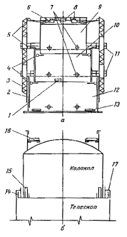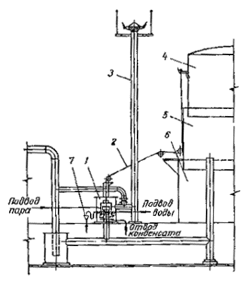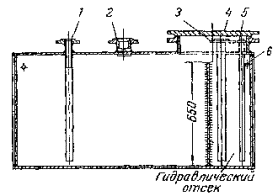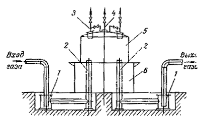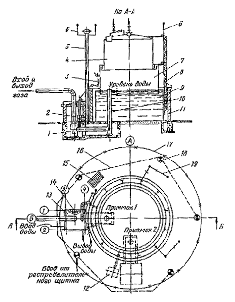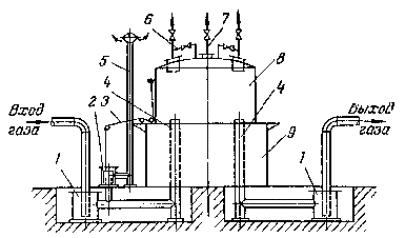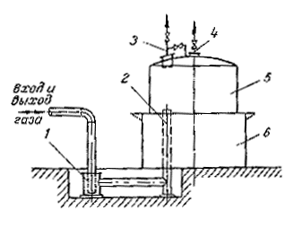 1 - клапанная коробка; 2 - подъемное устройство; 3 - труба сброса газа в атмосферу; 4 - колокол; 5 - телескоп; 6 - резервуар; 7 - переливная воронка.