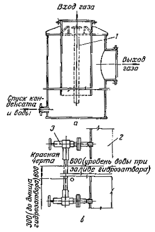 V-4. Гидравлический затвор (см. рис. 8) предназначен для отключения газгольдера от межцеховых газопроводов при ремонте, а также для отвода газового конденсата при работе газгольдера. Задвижка для залива водой гидрозатвора открывается вручную в камере газового ввода с обслуживающей площадки.