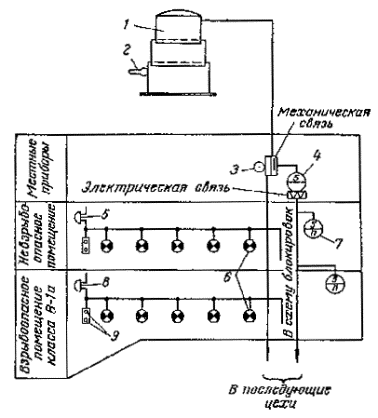1 - газгольдер; 2 - термометр технический ртутный; 3 - кулачковый регулируемый командо-аппарат; 4 - сельсин-датчик; 5 - электрический звонок; 6 - сигнальные лампы; 7 - сельсин-приемник; 8 - звонок во взрывозащищенном исполнении; 9 - кнопка управления.