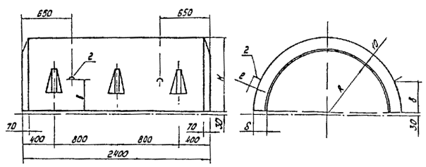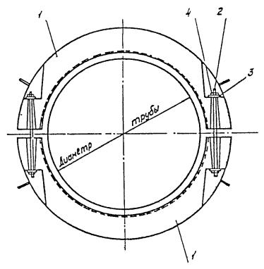 Рис. 1. Железобетонный утяжелитель типа 2-УТК: 1 - утяжелитель 2-УТК; 2 - шпилька МС 1; 3 - шайба МС 3; 4 - гайка М20 Рис. 2. Полукольцо утяжелителя типа 2-УТК 4.3.4. Весовые характеристики труб с утяжелителями объемной плотностью бетона 2300 кг/м3 приведены в табл.1 справочного приложения 6. Условное обозначение марки утяжелителя состоит из цифровых и буквенных обозначений. Марка расшифровывается следующим образом (например, 2-УТК-1420-24-2): 2 - в начале марки означает изменение в конструкции и армирование по сравнению с ранее выпущенными моделями; У - утяжелитель железобетонный; Т - для трубопроводов; К - кольцевой; 1420 - диаметр трубы, мм; 24 - длина утяжелителя, дм; 2 - в конце марки указывает, что утяжелители имеют большую массу по сравнению с ранее выпускавшимися. 4.3.5. При проверке качества изготовления грузов особое внимание следует уделить: чистоте отверстий под соединительные шпильки, не допуская попадания бетона в эти отверстия. Поставка утяжелителей с заплывшими отверстиями должна быть запрещена; точности расположения отверстий под соединительные шпильки и недопустимости их смещения ж теле бетона; качеству процесса вибрации бетона для получения необходимой его плотности; точности расположения монтажных петель на боковых поверхностях полуколец; установка их на верхней образующей грузов недопустима; 4.3.6. При монтаже утяжелителей на нескольких плетях трубопровода расстояние между плетями должно обеспечивать проезд трубоукладчиков, кранов, автомашин для выполнения сварочно-монтажных, изоляционных и других работ. Нижние и верхние кольца утяжелителей раскладывают параллельно подготовленным плетям трубопровода в два ряда вдоль оси трубы (рис. 3) с интервалом в соответствии с проектом. 4.3.7. Зафутерованный трубопровод с помощью трубоукладчиков укладывают на нижние элементы, после чего на них устанавливают верхние элементы утяжелителей. Шпильки вставляют в отверстия утяжелителей сверху, при этом верхние гайки должны быть навинчены на болт (не более чем на собственную высоту). Нижние гайки наворачивают на шпильку вручную без инструмента до отказа. Затем верхние гайки доворачивают гайковертом до получения следующих значений моментов сил: шпилька диаметром 20 мм - 15 кг×м; шпилька диаметром 24 мм - 26 кг. 4.3.8. Погрузку, разгрузку, складирование и раскладку полуколец утяжелителей производят за монтажные петли кранами или трубоукладчиками соответствующей грузоподъемности. Элементы утяжелителя можно поднимать как прямо, так и в перевернутом положении. Перевертывать элементы утяжелителя (из прямого положения) допускается за две петли, но при этом элементы не должны отрываться от земли. 4.3.9. Железобетонные элементы кольцевых утяжелителей, рассортированные по маркам и комплектам, должны храниться в штабелях на приобъектных складских площадях с выровненным плотным основанием. Нижний и последующие ряды элементов укладывают на деревянные подкладки высотой 80 и шириной 100 мм. Подкладки располагают у монтажных петель по вертикали одна над другой. Изделия укладывают в штабеля высотой не более 2,5 м. При хранении, транспортировки и монтаже элементов утяжелителей нельзя загибать монтажные петли. 4.3.10. На береговом участке монтаж железобетонных грузов на первую плеть производят в створе перехода (см. рис.3), при использовании спусковой дорожки - рядом с ней. Ст