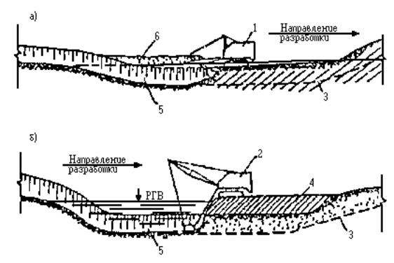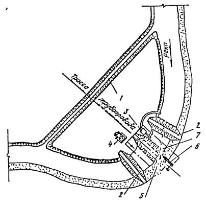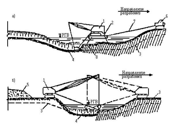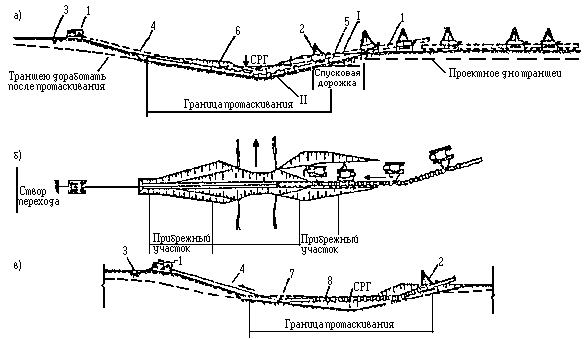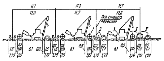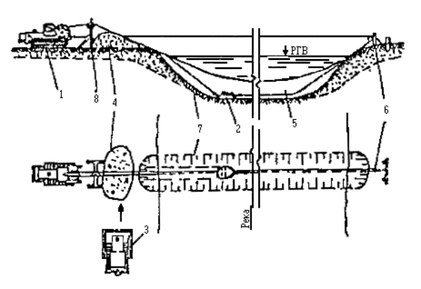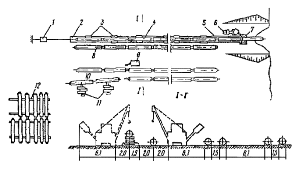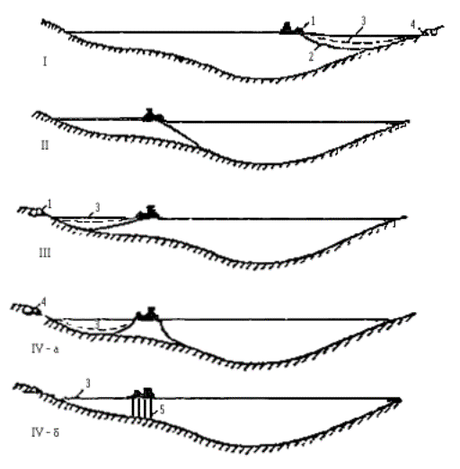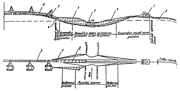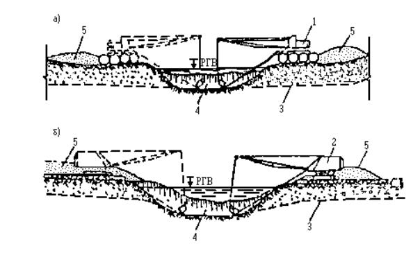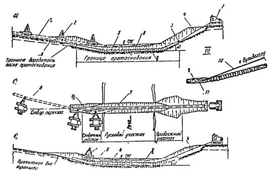 Примечание: Связные грунты разрабатывать экскаватором-драглайном нецелесообразно. Приложение 2Рекомендуемое ТЕХНОЛОГИЧЕСКИЕ СХЕМЫ СТРОИТЕЛЬСТВА МАЛЫХ ПЕРЕХОДОВ МАГИСТРАЛЬНЫХ ТРУБОПРОВОДОВ ЧЕРЕЗ РЕКИРис. 1. Разработка подводных траншей болотным экскаватором и экскаватором-драглайном со сланей: а - специальным болотным экскаватором ЭКБ; б - экскаватором-драглайном со сланей; 1 - экскаватор болотной модификации, 2 - экскаватор-драглайн на сланях; 3 - проектное дно траншеи; 4 - подводная траншея; 5 - отвал грунта Рис. 2. Разработка подводной траншеи экскаватором с обратной лопатой и драглайном: а - при глубине реки до 0,5 м; 6 - при работе с насыпной дамбы; 1 - экскаватор с обратной лопатой; 2 - экскаватор-драглайн; 3 - проектное дно траншеи; 4 - дамба; 5 - подводная траншея; 6 - отвал грунта за бровку траншеи Рис. 3. Последовательность разработки подводной траншеи экскаватором-драглайном: а - с понтона при глубине воды более 1,5 м; б - при глубине воды до 1,5 и ширине реки до 30 м; 1 - экскаватор-драглайн; 2 - подгон; 3 - проектное дно траншеи; 4 - подводная траншея; 5 - отвал грунта; 6 - трактор; 7 - трос; 8 - якорь Рис. 4. Разработка подводной траншеи скреперной установкой при расположении двухбарабанной тракторной лебедки на одном берегу: 1 - трактор с двухбарабанной лебедкой; 2 - скреперный ковш; 3 - бульдозер; 4 - отвал грунта; 5 - разрабатываемая траншея; 6 - анкерная опора с хвостовым блоком; 7 - тяговый трос; 8 - головная опора Рис. 5. Разработка траншей с отводом русла: 1 - отводное русло, разработанное экскаватором; 2 - насыпные дамбы, разбираются экскаватором после укладки и засыпки трубопровода; З - водоотливная установка; 4 - бульдозер, 5 - участок планировки траншеи бульдозером; 6 - экскаватор; 7 - траншея Рис. 6. Укладка трубопровода протаскиванием по дну: I - положение русловой плети в начале протаскивания; II - положение плети в процессе протаскивания; 1 - тяговая лебедка; 2 - кран-трубоукладчик; 3 - анкер; 4 - тяговый трос; 5 - оголовок; 6 - грунтовая дорожка; 7 - разработанная траншея; 8 - русловая плеть трубопровода Рис. 7. Укладка трубопровода с одной кривой механического гнутья: а - общий профиль; б - начало протаскивания; в - разворот трубопровода в вертикальное положение; I - положение русловой плети в процессе протаскивания; II - проектное положение трубопровода; 1 - тяговая лебедка; 2 - кран-трубоукладчик; 2 - анкер; 4 - тяговый трос; 5 - грунтовая спусковая дорожка; 6 - разработанная траншея; 7 - оголовок; 8 - русловая плеть Рис. 8. Укладка трубопровода с двумя кривыми механического гнутья: а - общий профиль; б - начало протаскивания; в - в процессе протаскивания; I - положение русловой плети в процессе протаскивания; II - проектное положение трубопровода; III - узел крепления тягового троса; 1 - бульдозер; 2 - кран-трубоукладчик; 3 - сферическая заглушка; 4 - тяговый трос; 5 - грузы; 6 - грунтовая дорожка; 7 - разработанная траншея; б - русловая плеть трубопровода; 9 - удавка; 10 - тяговый трос; 11 - шлаги Рис. 9. Укладка трубопровода с дамбы: I - положение русловой плети в процессе укладки; II - проектное положение русловой плети; 1 - кран-трубоукладчик; 2 - бульдозер; 3 - русловая плеть трубопровода; 4 - разработанная траншея; 5 - дамба; 6 - водопропускные трубы; 7 - тросовая оттяжка Приложение 3Рекомендуемое ТИПЫ БЕРЕГОУКРЕПЛЕНИЯ И УСЛОВИЯ ИХ ПРИМЕНЕНИЯ НА ПОДВОДНЫХ ПЕРЕХОДАХ ТРУБОПРОВОДОВ