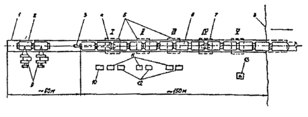 tСМ - время, затрачиваемое на самую продолжительную операцию на одном из постов, мин; tПР - время, затрачиваемое на протаскивание плети на длину одной секции, мин; tК - время на просвечивание стыка, мин. 5.3.10. Профиль спусковой дорожки при поточно-расчлененном методе монтажа и укладки трубопровода должен быть спланирован таким образом, чтобы рабочие посты сборки и сварки секции были расположены на прямолинейном участке или криволинейном с радиусом 5000 м и более. 5.4. Укладка трубопровода свободным погружением 5.4.1. Способ укладки свободным погружением с заполнением полости водой следует применять для трубопроводов, имеющих положительную плавучесть. 5.4.2. Для укладки трубопроводов, положительная плавучесть которых обеспечивается закреплением понтонов, можно применять способ свободного погружения путем последовательного открепления понтонов. 5.4.3. В технологический процесс укладки трубопроводов способом свободного погружения с заполнением их водой входят: монтаж трубопровода на спусковой дорожке или стапеле (при этом способе укладки трубопровода монтажный стапель можно располагать вне створа перехода); оснащение трубопровода разгружающими понтонами в соответствии с проектом производства работ, а также вентилями для выпуска воздуха и заливки воды в трубопровод; спуск трубопровода на воду; буксировка трубопровода к месту укладки (если монтаж выполняется не в створе сооружения); установка плавающего трубопровода в створе перехода; погружение плавающего трубопровода в проектное положение путем заполнения его водой с одновременным выпуском воздуха через вентиль на противоположном конце трубопровода. Рис. 5. Схема укладки трубопровода диаметром 1420 мм поточно-расчлененным методом: I - пост сборки и сварки корневого шва; II - пост сварки первого, второго и третьего слоев шва; III - пост сварки четвертого и пятого слоев ива; IV - пост контроля стыка; V - пост изоляции и защиты стыка; 1 - рельсовая или роликоопорная спусковая дорожка; 2 - звано из двух забалластированных труб на спусковой дорожке; 3 - штанга внутреннего центратора; 4 - внутренний центратор; 5 - защитная палатка; 6 - монтируемая плоть трубопровода; 7 - гамма-дефектоскоп; 8 - урез воды, 9 - трубоукладчики; 10 - энергоблок для подогрева стыка; 11 - сварочные агрегаты для шлифовальных машин; 13 - командный пункт с радиосвязью 5.4.4. Способ укладки трубопроводов свободным погружением рекомендуется при следующих условиях: пересекаемая водная преграда несудоходна или в месте перехода возможен перерыв судоходства на время установки трубопровода; поверхностная скорость течения невелика (до 0,6 - 0,8 м/с) и не требуются сложные устройства для удержания плавающей нитки трубопровода в створе перехода; трассировка перехода на берегах предусматривает прокладку трубопроводов с кривыми вставками. вес трубопровода в различных положениях в воде и его массу на суше; силу воздействия потока воды на трубопровод, необходимость закрепляющих устройств (боковых оттяжек) и их расчет; допустимую глубину погружения трубопровода при его заполнении водой; напряжения, возникающие в трубопроводе от воздействия всех нагрузок на трубопровод в процессе погружения на дно (напряжения от изгиба в вертикальной плоскости и гидродинамического давления); Качество и мощность буксирных средств, необходимых для буксировки тр