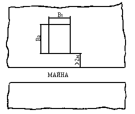 где В1 - длина опоры, параллельной прорези, м (см. рисунок); В2 - длина опоры, перпендикулярной к прорези, м (см. рисунок). Прочие обозначения аналогичны принятым для формулы (2). При размещении груза на ледяном покрове около прорези (майны) расстояние от опоры груза до края майны не должно быть меньше 2,0 м (см. рисунок). 3.4. Для предварительных расчетов толщину льда при отсутствии в ледяном покрове майн и трещин можно определять из выражения: