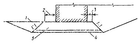 деревоплиты - пропитку синтетической, фенолформальдегидной смолой согласно 5. ОСНОВНЫЕ КОНСТРУКТИВНЫЕ ТРЕБОВАНИЯ К ПРИЧАЛЬНЫМ СООРУЖЕНИЯМ ГРАВИТАЦИОННОГО ТИПА5.1. Требования, изложенные в настоящем разделе, распространяются на следующие конструкции гравитационных причальных сооружений: уголковые стенки контрфорсного типа; уголковые стенки с внешней анкеровкой, имеющие в вертикальной плоскости две опоры: верхнюю - в точке крепления анкера и нижнюю - на низком пороге фундаментной плиты; уголковые стенки с внутренней анкеровкой; стенки из массивовой кладки в поперечном сечении без вертикальных швов и с массивами верхнего курса, имеющими разгружающий консольный свес. 5.2. Причальные сооружения гравитационного типа, особенно из правильной кладки массивов, не следует применять при неблагоприятных геологических условиях, когда можно ожидать значительной и неравномерной осадки основания сооружения. Длина секции определяется в зависимости от геологического строения основания, высоты стенки и толщины постели: для скального основания при толщине выравнивающего слоя из каменной наброски до 1,5 м - не более 45 м; для нескальных оснований при глубине у причала до 13 м - не более 30 м, при глубине 13 м и более - не более 40 м. Примечания: 1. Увеличение длины секции допускается при специальном обосновании в проекте. 2. Разбивка стенки на секции должна производиться с учетом обязательного устройства швов в местах возможной резкой разницы в осадках отдельных частей сооружения (в местах изменения грунтовых условий, примыкания нового сооружения к старому, изменения высоты стенки). 5.4. Для причальных сооружений гравитационного типа, возводимых на нескальных грунтах, следует устраивать постель из каменной наброски. При этом на грунты основания следует укладывать обратный фильтр из щебня или гравия толщиной не менее 0,3 м, за исключением случая, когда основание сложено из крупнозернистых грунтов (см. примеч. 1 к п. 3.8 настоящей Инструкции). Если основание сооружения сложено из скальных грунтов, каменная постель не устраивается, а в основание стенки укладывается выравнивающий слой из каменной наброски толщиной не менее 0,5 м. Рис. 1. Фрагмент поперечного разреза причальной стенки: 1 - проектное дно; 2 - берма шириной не менее 2 м; 3