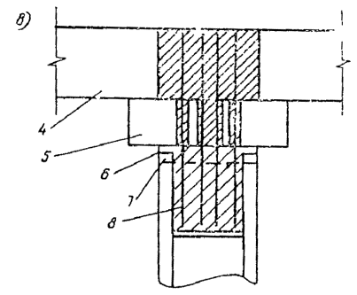 Рис. 2. Поперечный разрез стыковых соединений ростверков (зоны заполнения бетонов заштрихованы): 1 - длина анкеровки арматуры; 2 - дополнительная арматура; 3 - конструктивный наголовник; 4 - плита верхнего строения; 5 - ригель; 6 - обруч из металлической полосы; 7 - бетонная подготовка; 8 - бетон заполнения сваи-оболочки 7.6. В температурных швах причальных эстакад для передачи нагрузок от судов на соседние секции следует предусматривать зубья, шпонки или иные упорные устройства. 7.8. В ростверках из сборных железобетонных элементов для заделки арматурных выпусков голов свай должны быть устроены штрабы, заполняемые при сборке сооружения монолитным бетоном. Штрабы должны иметь наклон боковых поверхностей, обеспечивающий надежную передачу осевых нагрузок на опоры (рис. 2, а). Примечание. Требования к наклону поверхностей штраб не распространяются на случаи, регламентированные п. 7.9 настоящей Инструкции. 7.9. При устройстве на сваях конструктивных наголовников или наличии сборных элементов ригеля, перекрывающих штрабы в ростверке (рис. 2, б и в), допускается: а) заделка арматурных выпусков из свай в монолитном бетоне, укладываемом в полости конструктивных наголовников, с постановкой дополнительной арматуры, связывающей наголовник с ростверком (см. рис. 2, б); б) стволы свай-оболочек не заделывать в ростверк из предварительно напряженного железобетона, ограничиваясь лишь обеспечением плотного примыкания торцов оболочек (см. рис. 2, в). Плотное примыкание может быть обеспечено путем укладки в контакте торца оболочки с ростверком монолитного бетона или раствора, с установкой шашек, обеспечивающих проектные отметки ростверка. Стык опор с ростверком в этом случае следует омоноличивать с помощью дополнительной арматуры, пропущенной через штрабы в ригеле и заделанной нижним концом в монолитный бетон, укладываемый в полость сваи-оболочки, а верхним концом - в бетон заполнения штрабы ростверка. Стык между опорой и ростверком необходимо защитить от коррозионных воздействий. 7.10. Сборные элементы, из которых составляется верхнее строение железобетонных причальных эстакад, следует соединять связями, обеспечивающими единство работы конструкции под воздействием нагрузок. При определении конструкций связей между сборными железобетонными элементами секций ростверков причальных эстакад следует руководствоваться следующими указаниями: а) рабочие стыки сборных элементов ростверков, воспринимающие изгибающие моменты и поперечные силы, создаются путем сварки выпусков арматуры и укладки бетона омоноличивания или путем сварки закладных частей (см. п. 3.21 настоящей Инструкции); б) стыки сборных элементов ростверков, воспринимающие поперечные силы, создаются путем устройства в примыкающих поверхностях элементов штраб с последующим заполнением их монолитным бетоном и установкой спиральной арматуры; в) отдельные стыки между сборными элементами ростверка допускается выполнять без связей, «открытыми», в том случае, когда это приемлемо по условиям работы сооружения, а относительные смещения по линиям примыкания допустимы по условиям эксплуатации. 7.11. Ростверки причальных эстакад следует устраивать без грунтового (песчаного, гравийного и щебеночного) балласта. Для выравнивания поверхности, образуемой сборными элементами, ее покрывают слоем цемент