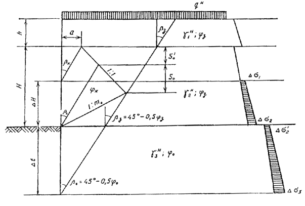 по формулам: m0 и q - заложение и угол наклона откоса котлована;