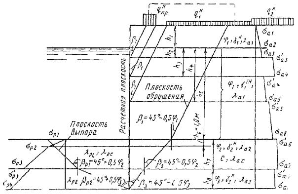 d - угол трения грунта о стенку; j - то же, что в п. 8.22 настоящей Инструкции. 8.27. При построении эпюр активного и пассивного давлений рекомендуется определять ординаты на границах слоев грунта с неизменными физико-механическими характеристиками, а также в местах пересечения расчетной плоскости восприятия распорного давления с плоскостями обрушения, проведенными из точек начала или скачкообразного изменения равномерно распределенной нагрузки, расположенной на территории причала, считая, что передача давления с территории на расчетную плоскость происходит по плоскости обрушения (рис. 7). 8.28. Расчет элементов надстроек на прочность и трещиностойкость следует выполнять на действие следующих сил: а) активного давления от собственного веса грунта с учетом эксплуатационных временных крановых и складских нагрузок; б) нагрузок от воздействия судов (натяжения швартовов, навала пришвартованного судна или навала судна при подходе); в) нагрузки от собственного веса элементов конструкции надстройки. 8.29. Расчет устойчивости оснований, сложенных из медленно уплотняющихся (сильно сжимаемых) водонасыщенных глинистых и заторфованных грунтов (при степени влажности G ³ 0,85, модуле деформации Е0 £ 500 тс/м2, коэффициенте консолидации Gv £ 1×107 см2/год и показателе консистенции IL ³ 0,75), следует выполнять с учетом нестабилизированного состояния указанных грунтов. Это связано с уменьшением касательного напряжения t по площадке скольжения в результате образования избыточного давления и в паровой воде. При этом касательные напряжения t = (p-u) tgj1 +c1, (32) где р - нормальное напряжение. Рис. 7. Эпюры активного и пассивного давлений от грунта и временных нагрузок. Основные зависимости для рассмотренного примера.