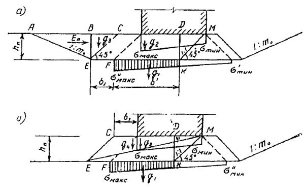m0 - заложение откоса котлована; lp - то же, что в п. 8.25 настоящей Инструкции, б) для случая постели на поверхности грунта основания (рис. 9, б): скольжение по плоскости КЕ - по формуле (45) при g3 = 0 и Ер =0; скольжение по наклонной плоскости ME - по формуле
