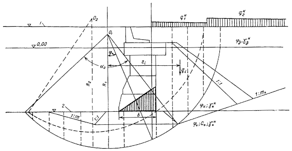 где Gi - вес элемента массива грунта с однородным основанием и временной нагрузкой в соответствии с указаниями п. 6 настоящего приложения; bi - ширина рассматриваемого элемента массива грунта; q - угол наклона плоскости скольжения к горизонту; ji и ci - соответственно угол внутреннего трения и сцепление в основании элемента массива грунта.