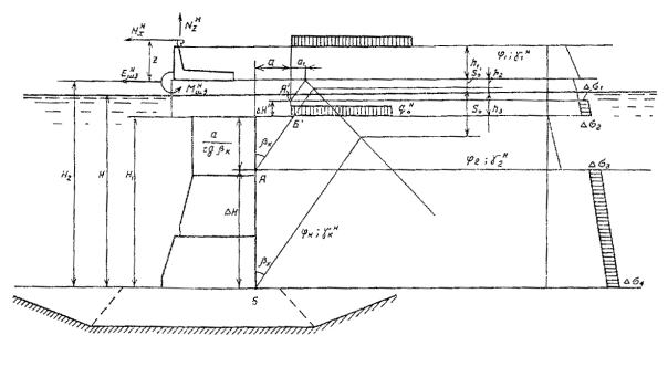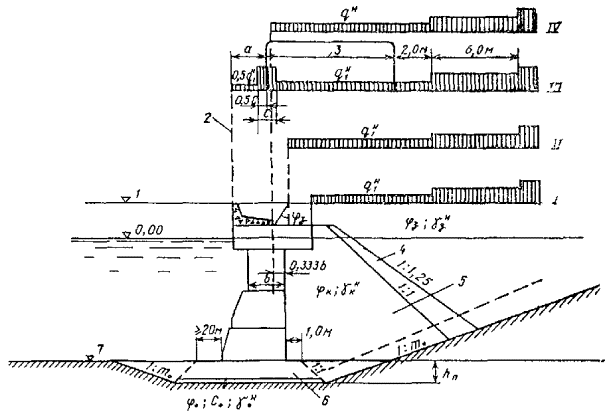причального сооружения из массивовой кладки 1 - отметка кордона, 2 - линия кордона; 3 - колея портала; 4 - обратный фильтр; 5 - каменная разгрузочная призма; 6 - каменная постель; 7 - отметка дна, а - величина, которая принимается по нормам технологического проектирования морских портов I случай - временная нагрузка располагается за пределами стенки, начиная от тылового обреза разгрузочной платформы. При таком расположении нагрузки выполняются расчеты на устойчивость по схеме плоского сдвига по контакту стенки с постелью, совместно с постелью и по швам кладки, проверяется положение равнодействующей нагрузок (эксцентриситет) по подошве стенки и в швах кладки, а также в необходимых случаях - устойчивость на опрокидывание (на поворот вокруг переднего ребра); II случай - временная нагрузка располагается над тыловой частью сооружения и распределяется на 1/3 ширины массива предпоследнего курса кладки. Указанный случай является определяющим при проверке растягивающих нормальных напряжений со стороны акватории в шве основания верхнего курса массивов; III случай - временная нагрузка располагается над стенкой до линии кордона или линии возможного загружения по технологическим условиям. В указанном расчетном случае определяются максимальные нормальные контактные напряжения в каменной постели на контакте с основанием стенки и в грунте основания на контакте с каменной постелью. Кроме того, определяются толщина постели, а также усилия в лицевой стенке надстройки при расчете ее по прочности и раскрытию трещин; IV случай - временная нагрузка располагается за пределами надстройки, над тыловой частью сооружения. Указанный расчетный случай является определяющим для расчета устойчивости надстройки; V случай - по п. 9.10 при расчете на общую устойчивость по круглоцилиндрическим поверхностям скольжения (сдвига) (см. рис. 10). 14.2. Распорное давление на массивную стенку от собственного веса грунта и временных нагрузок определяется в соответствии с указаниями пп. 8.20-8.24, с учетом трения материала засыпки по тыловой плоскости стенки (по плоскости восприятия распора). При этом следует иметь в виду, что: а) угол трения d материала засыпки по грунту в пределах высоты надстройки принимается равным углу j3 внутреннего трения материала засыпки; б) угол трения d каменной наброски по тыловой поверхности бетонных массивов в пределах высоты разгрузочной призмы принимается равным 0,5 jк (jк - угол внутреннего трения каменной наброски); в) угол трения d материала засыпки по тыловой поверхности бетонных массивов (из-за ограниченного простирания слоя каменной отсыпки) принимается равным 0,5 j3. 14.3. В пределах высоты надстройки при расчете ее на устойчивость угол наклона a плоскости восприятия распора в грунте засыпки и соответствующий ему угол обрушения b определяются в соответствии с указаниями п. 8.23 настоящей Инструкции. Примечание. При надстройках высотой до 3 м и временной нормативной нагрузке qн £ 4 тс/м2 плоскость восприятия распора вертикальна и угол обрушения b вычисляется при a = 0 и Sb = 0. 14.4. В пределах каменной разгрузочной призмы эпюра активного давления строится по указаниям п. 8.24. Ординаты Dsi дополнительного давления от пригрузки грунта из-за неполноты простирания каменной наброски (рис. 18) рассчитываются по формуле (20). Тогда ординаты Dsi равны: в точке А¢