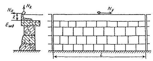 формуле внецентренного сжатия отрицательные напряжения показаны условно; размеры и отметки указаны в метрах. Рис. 1. Схема огрузки постели стенки из массивовой кладки с отметкой кордона плюс 2,80 м Таблица напряжений на постель, кг/см2