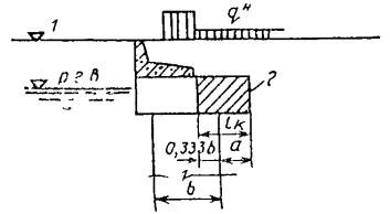 y - угол между подошвой стенки и плоскостью сдвига. 9.10. При расчете общей устойчивости гравитационных причальных сооружений по схеме глубинного сдвига следует руководствоваться указаниями пп. 8.15 и 8.16 настоящей Инструкции. Для гравитационных стенок из массивовой кладки в расчете по круглоцилиндрическим поверхностям скольжения следует в пределах ширины основания стенки собственный вес сооружения, вес материала засыпки и временные нагрузки (рис. 10) над ним приводить к эпюре вертикальных сил по формулам (36) и (39), исключив действие горизонтальных нагрузок, т.е. принимая в формуле (36) значение М0 = 0. Эксплуатационную нагрузку на территории причала следует располагать в соответствии со схемой на рис. 10. Рис. 10. Схема расположения эксплуатационных нагрузок: 1 - отметка кордона; 2 - отметка дна При расчете общей