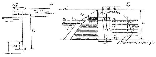 где nt = 0,8 - коэффициент безопасности. Остальные обозначения приняты в соответствии с пп. 8.20 и 8.25 настоящей Инструкции. Примечание. О методе расчета давления грунта см. примечание к п. 16.12 настоящей Инструкции. 16.23. Усилия, действующие на один элемент анкерной стенки, при расчете ее прочности и трещиностойкости определяются по формулам (74), (76) и (77) при коэффициенте mс = 1. 16.24. При заглублении гребня анкерной плиты на глубину, равную ее высоте, отпор и распор грунта принимаются в пределах от подошвы плиты до поверхности территории (рис. 23, а). При больших заглублениях анкерной плиты грунтовые нагрузки, действующие непосредственно на анкерную плиту, учитываются лишь в пределах ее высоты. Рис. 23. Расчетные схемы анкерных плит a - для определения устойчивости, б -
