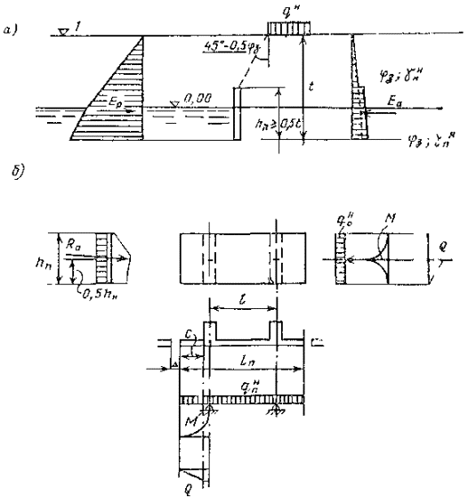 g = 1,75 - коэффициент для прямоугольного сечения; W0 = hэ/6 - упругий момент сопротивления сечения эквивалентного массива шириной 1 м и высотой hэ (для глубин у причала до 11,5 м hэ = В/4; для глубин 13 м и более hэ = В/3); В - длина эквивалентного массива, равная размеру фундаментной плиты в плоскости действия изгибающего момента; при расчете фундаментной плиты в направлении, перпендикулярном линии кордона, равна ширине основания сооружения, в направлении, параллельном линии кордона, - ширине фундаментной плиты. Примечание. Армирование нижней и верхней зон фундаментной плиты в двух направлениях производится по изгибающим моментам, определенным по формуле (56) с учетом указаний пп. 8.7, 8.10 и 8.11 настоящей Инструкции. 11.5. Растягивающее усилие в анкерной тяге определяется как опорная реакция из расчета лицевой плиты в вертикальном направлении, при этом нагрузки учитываются в соответствии с указаниями пп. 10.4 и 11.1 (I случай). 11.6. Расчет элементов железобетонных конструкций на прочность и трещиностойкость лицевой и фундаментной панелей выполняется в соответствии с указаниями глав СНиП на бетонные и железобетонные конструкции гидротехнических сооружений, на бетонные и железобетонные конструкции и пп. 8.7, 8.8, 8.10 и 8.11 настоящей Инструкции. 11.7. Расчет анкерных устройств и деталей их крепления на устойчивость следует выполнять в соответствии с указаниями разд. 16 и прил. 3 к настоящей Инструкции, по прочности - по требованиям глав СНиП на стальные конструкции, на бетонные и железобетонные конструкции гидротехнических сооружений, на бетонные и железобетонные конструкции и пп. 8.7-8.11 настоящей Инструкции.12. РАСЧЕТ ПРИЧАЛЬНЫХ СООРУЖЕНИЙ УГОЛКОВОГО ТИПА С ВНУТРЕННЕЙ АНКЕРОВКОЙ12.1. Расчет уголковых причальных сооружений с внутренней анкеровкой на устойчивость по схеме плоского сдвига и общую устойчивость, а также определение толщины постели и нормальных контактных напряжений выполняют по указаниям пп. 9.3-9.10 и 10.1-10.4. 12.2. Изгибающие моменты и поперечные силы, действующие в лицевой плите уголковой стенки с внутренней анкеровкой, определяют на основе расчетов, выполняемых в соответствии с указаниями пп. 10.1, 10.2, 10.4-10.6. 12.3. Усилия, действующие в фундаментной плите, допускается определять обоснованными методами расчета с учетом воздействия лицевой вертикальной плиты, анкерной тяги, пригрузки от грунта засыпки за стенкой, а также неравномерности планировки постели. 12.4. Растягивающее усилие в анкерной тяге определяется как опорная реакция на основе расчета лицевой плиты в вертикальном направлении. Изгибающий момент в анкерной тяге, возникающий под действием давления зависающего грунта, эксплуатационной нагрузки и собственного веса тяги, допускается определять обоснованными методами. 12.5. Расчет лицевой и фундаментной плит на прочность и трещиностойкость выполняется по главам СНиП на бетонные и железобетонные конструкции гидротехнических сооружений, на бетонные и железобетонные конструкции и пп. 8.7, 8.8, 8.10 и 8.11 настоящей Инструкции. При этом лицевая плита в вертикальном направлении рассчитывается на внецентренное сжатие, в горизонтальном - на изгиб. 12.6. Анкерная тяга и ее крепления рассчитываются на прочность в соответствии с указаниями главы СНиП на стальные конструкции, а также п. 8.9 и прил. 3 к настоящей Инструкции. 13. РАСЧЕТ УГОЛКОВЫХ ПРИЧАЛЬНЫХ СООРУЖЕНИЙ 
