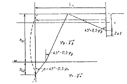 Примечания: 1. Допускается пассивное давление грунта определять по классической теории, исходящей из прямолинейных поверхностей скольжения в призме отпора. В этом случае ординаты пассивного давления определяются по формулам (24) и (25), в которых значения lp принимаются по табл. 3 прил. 6 к настоящей Инструкции, а lpc - по формуле