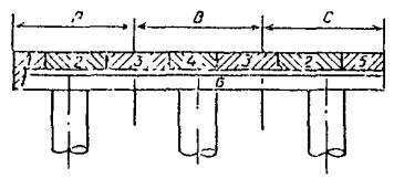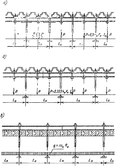 где kн, nc, n - то же, что в п. 8.8 настоящей Инструкции; mд - коэффициент, определяемый по табл. 3 настоящей Инструкции; a - угол наклона анкерной тяги к горизонту; R - расчетное сопротивление растяжению материала стали анкерной тяги, принимаемое по главе СНиП на стальные конструкции. В местах резьбовых соединений расчетное поперечное сечение тяги принимается по внутреннему диаметру резьбы. Распределительный пояс Балки распределительного пояса рассчитываются по схемам многопролетных балок (см. рисунок). Число пролетов принимается в зависимости от разрезки распределительного пояса. Рекомендуется балки распределительного пояса в пределах секции устраивать непрерывными и составлять их путем соединения сварными равнопрочными швами. В этом случае расчет рекомендуется выполнять по схеме пятипролетной балки. Нагрузки на балки распределительного пояса допускается определять из условия равномерного распределения усилий между шпунтинами. Нагрузки на балку могут передаваться болтами крепления в виде равных сосредоточенных сил (см. рисунок, а и б) или всей плоскостью шпунта в виде равномерно распределенной нагрузки (см. рисунок, в) Расчетный момент для подбора сечения балок распределительного пояса рекомендуется определять по формулам: для схемы на рисунке, а