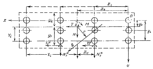 где Hyi и Hxi - реакции опор от единичного горизонтального смещения по пп. 17.10 и 17.11 настоящей Инструкции; xi и уi - координаты опор относительно осей х и у (см. рис. 26). Примечание. Для упрощения определения и отсчета координат упругого центра целесообразно за начало координат принимать точку О пересечения осей крайних рядов опор (см. рис. 26). 17.14. Усилия в элементах свайного основания: от составляющих