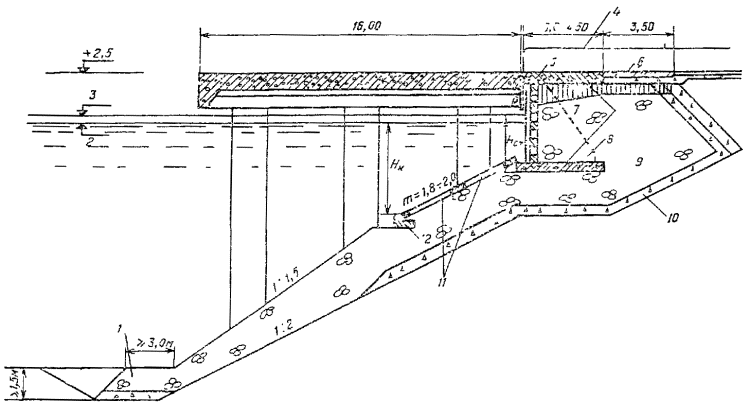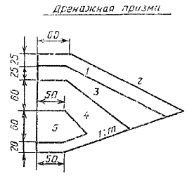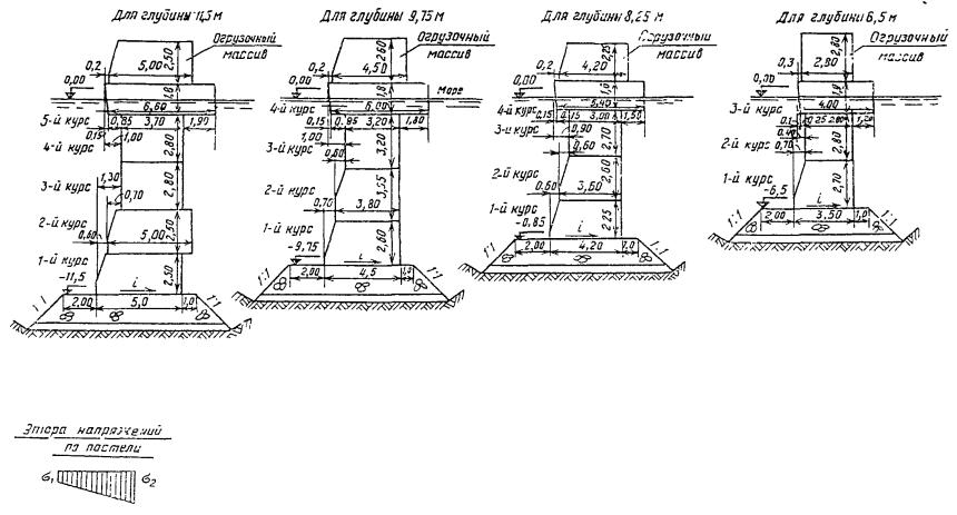 17.26. Несущую способность свай всех типов и свай-оболочек следует определять как наименьшее из значений, полученных при расчетах: по условию сопротивления грунта основания сваи - в соответствии с требованиями главы СНиП на свайные фундаменты и п. 17.25 настоящей Инструкции; по условию сопротивления материала сваи - в соответствии с главами СНиП на бетонные и железобетонные конструкции гидротехнических сооружений, на бетонные и железобетонные конструкции, на стальные конструкции, на деревянные конструкции и пп. 8.7 и 8.9 настоящей Инструкции. Примечание. Несущую способность опор по грунту следует уточнять по результатам испытаний динамической и статической нагрузкой. Необходимость и количество испытаний устанавливается организацией, разрабатывающей проект. 17.27. В конструктивных расчетах прочности и трещиностойкости, выполняемых в соответствии с указаниями глав СНиП на бетонные и железобетонные конструкции гидротехнических сооружений, на бетонные и железобетонные конструкции и на стальные конструкции, расчетную длину опор l0 внецентренно-сжатых элементов допускается определять как произведение коэффициента приведения длины m (см. прил. 10 настоящей Инструкции) и геометрической высоты l (от условной заделки в грунте основания до низа ростверка). ПРИЛОЖЕНИЕ 1Дренажные устройстваЭффективным устройством для снятия подпора грунтовых вод с конструкции сооружения при засыпке пазух несвязным грунтом является щебеночный (гравийный) дренаж с водоотводами в сторону акватории. Назначение дренажа - хорошо пропускать воду и предотвращать вымывание грунта засыпки. Для этого необходимо так подобрать гранулометрический состав материала дренажа, чтобы размеры частиц самой мелкой его фракции в три-четыре раза превышали размеры удерживаемых частиц грунта. Конструкция дренажной призмы выбирается в зависимости от грунта обратной засыпки. Конструкция, представленная на рисунке, рекомендуется при обратной засыпке мелким песком. Та же конструкция с сокращением на верхний слой применима при засыпке среднезернистым песком. При обратной засыпке крупнозернистым песком рекомендуется исключить еще слой гравелистого песка. При засыпке скальным грунтом гранулометрический состав дренажного фильтра следует подбирать таким образом, чтобы он удерживал самую мелкую фракцию скального грунта. Боковые и верхние фильтрующие слои дренажной призмы, отсыпаемые из одной фракции, должны иметь толщину не менее 25 см, а слои из смешанного щебня - не менее 50 см. Дренажная призма устраивается непрерывной вдоль линии кордона, непосредственно за лицевой стенкой. Водоотводные отверстия в лицевой стенке располагаются со следующим шагом: в безливных морях при ожидаемом подпоре грунтовых вод до 1 м относительно расчетного уровня воды - приблизительно через 10 м, при подпоре более 1 м - приблизительно через 5 м; в ливных морях с амплитудой колебаний уровня более 2м - приблизительно через 3 м. Водоотводные отверстия рекомендуется располагать ниже среднего уровня воды в безливных морях или среднего уровня воды при отливе в ливных морях, но не выше 0,5 м над расчетным уровнем. ПРИЛОЖЕНИЕ 2Огрузка постели набережной стенки из массивовой кладкиДля стенки из массивовой кладки, представленной на рис. 1 и 2, при отсыпке и равнении постели следует обеспечивать строительный 