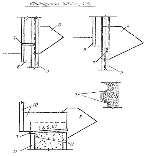 Схемы дренажных устройств: 1 - среднезернистый песок; 2 - мелкозернистый песок; 3 - гравелистый песок; 4 - щебень из смеси фракций 40-70 мм - 30%, 20-40 мм - 30%, 3-10 мм - 40%; 5 - камень 15-20 см; 6 - железобетонный оголовок; 7 - водовыпуск; 8 - дренажная призма; 9 - стальной шпунт; 10 - железобетонная надстройка; 11 - железобетонная свая-оболочка; 12 - уплотнение шва из досок Таблица напряжений на постель, кг/см2