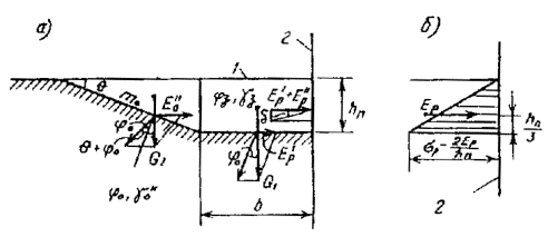 fг - коэффициент трения каменной постели по грунту основания; принимается равным tg jг. В обоснованных случаях следует уточнять значение fг экспериментальным путем; Рис. 9. Эпюры краевых напряжений по контакту каменной постели и основания: а - при постели, заглубленной в грунт основания; б - при постели, расположенной на поверхности грунта основания Ер - удерживающая горизонтальная сила от грунта засыпки, определяемая по одной из формул: сопротивление грунта засыпки в контуре ABE