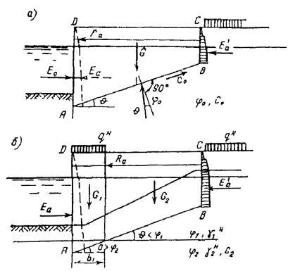 a - угол наклона задней грани стенки к вертикали (при наклоне от грунта он положителен, при наклоне на грунт - отрицателен); d - угол трения грунта о наклонную грань стенки;