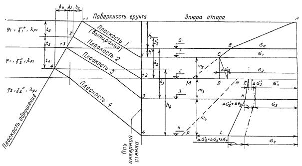 Окончательная (суммарная) эпюра отпора - ABCDEKL. Эпюра отпора при нормальном удалении стенки - ABMNP (см. рисунок и пп. 8.25, 16.4 и 16.24 настоящей Инструкции).