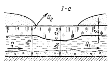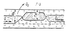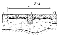 Площадь фильтрационной зоны до постройки моста принимается равной пятикратной длине отверстия моста. При полной длине балок до 18 м, ширине опор 1,0 м и толщине фильтрационного слоя 5,6 м площадь фильтрации после промерзания в естественных условиях будет wФ=5[4(18-1)3,48]=1183 м2. Площадь стеснения фильтрационного потока постройкой моста (см. рис. 3, формулу 18 и табл. 2) wС=nОП(b+2b1)(d-df)+(d'f-df)(l-2b1)nПР=5(1+2×0,264)(5,6-2,12)+(2,42-2,12)(17-2×0,264)4= =108 м2. где d'f=2,4 м - глубина промерзания под мостом. Коэффициент, учитывающий стеснение,