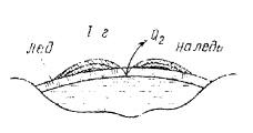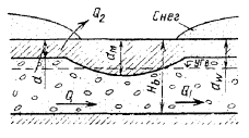 где lНИ - длина наледи в год изысканий. На реках наледи иногда имеют длину несколько километров. В таких случаях длину прогнозируемой наледи определяют непосредственными измерениями размеров наледной поляны. Прогнозирование параметров наледей смешанного питания3.11. Большинство наледей на небольших реках имеет смешанное питание. В начале своего развития наледь питается речными водами. Когда водоток промерзает до дна, питание происходит грунтовыми подрусловыми водами и во многих случаях подземными источниками, разгружающимися в речной аллювий. 3.12. Прогнозирование расчетных параметров наледей этого типа производится изложенным выше вероятностным методом переходных коэффициентов. По данным ближайшей метеостанции, для 20-25 последовательных лет составляют таблицы среднемесячных температур воздуха, толщины снежного покрова и сумм жидких осадков. Продолжительность периодов промерзания и жидких осадков принимают с учетом климатических условий согласно п. 3.5. Сначала для каждого года ряда лет определяют время, необходимое для промерзания поверхностного потока воды глубиной hВ. Глубину воды принимают средней по ширине живого сечения. Ее определяют от уровня ледостава при ледомерной съемке, когда река бывает промерзшей до дна, и измеряют толщину образовавшегося льда hЛ. Время, необходимое для нарастания льда толщиной hЛ, где Ln - скрытая объемная теплота льдообразования, Дж/м3; hЛ и hC - соответственно толщина льда и снега, м; lЛ и lС - соответственно коэффициент теплопроводности льда и снега, Вт/(м×°С); tn - среднемесячная температура воздуха, °С; a - коэффициент теплоотдачи, Дж/(м2×с×°С). Вычисленное по формуле (23) количество дней, необходимых для промерзания поверхностного потока, вычитают из общего количества дней периода промерзания. В оставшееся время происходит промерзание грунтового подруслового потока. Глубину его промерзания для каждого года ряда лет определяют по формуле В.С. Лукьянова где 0,8 - понижающий коэффициент, вводится по согласованию с ВНИИ транспортного строительства в связи с тем, что формула (24) не учитывает фильтрацию и тепловой поток к фронту промерзания от нижележащего грунта; lМ - коэффициент теплопроводности мерзлого грунта; tВ - средняя температура воздуха за период промерзания, °С; tЗ - температура замерзания грунта, °С; t - длительность периода промерзания, с; q - расход тепла на замерзание 1 м3 грунта, Дж/м3; СМ - объемная теплоемкость мерзлого грунта, Дж/(м3×°С); S - средняя за зиму толщина эквивалентного слоя, характеризующая условия теплоизоляции грунта, м. Средняя за период промерзания грунта толщина эквивалентного слоя теплоизоляции снежного и ледяного покрова