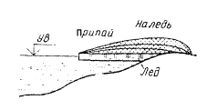 3.9. Определение объема и средней толщины наледи связано с необходимостью ледомерных съемок по предварительно установленным ледомерным вехам или буровым скважинам. Для распластанных речных долин с плоским, относительно ровным дном прогнозирование расчетной (максимальной) толщины наледи с заданной вероятностью превышения в отдельных случаях можно приближению производить по максимальной толщине наледи, определенной в год изысканий, по формуле Zmax p=gnZmax иkxkfkc, (21) где gn - коэффициент надежности, принимаемый равным 1,20; Zmax и - максимальная толщина наледи в год изысканий. 3.10. Расчетная ширина наледи Внр может быть определена по ее расчетной толщине графическим путем. Для этого вычерчивают в масштабе поперечное сечение речной долины или лога по оси перехода, наносят линию уровня расчетной толщины наледи и по горизонтальному расстоянию между точками пересечения линии уровня наледи с поверхностью земли определяют ширину наледи у сооружения. Расчетная длина наледи lнр в небольших логах может быть определена простейшим геометрическим построением. Принимая продольный уклон поверхности наледи с заданной вероятностью превышения равным уклону наледи в год изысканий, из подобия треугольников получим длину прогнозируемой наледи: