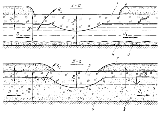 где Sx - коэффициент сопротивления грунтовой перемычки; d - коэффициент, значения которого определяют из условий (40-41); dfм - максимальная глубина промерзания под искусственным сооружением или на естественном участке, м; dw - глубина залегания зеркала грунтовых вод, м; d' - коэффициент, определяемый в зависимости от отношения глубины залегания зеркала грунтовых вод к глубине залегания водоупора: dw/HВ 0,03 0,05 0,10 0,15 0,20 0,25 0,30 d'................ 0,26 0,35 0,47 0,60 0,67 0,73 0,80 Максимальная толщина грунтовой наледи Zн max=YZн ср. (42) Рис. 4. Схемы образования наледей, вызванных нарушением естественных водно-тепловых условий: I-а - на поверхностных водотоках; II-а - при грунтовом потоке: 1 - речной лед; 2 - снег; 3 - аллювиальные отложения; 4 - водоупор; 5 - мерзлый грунт; Q2 - излив наледеобразующей воды Рис. 5. Графики