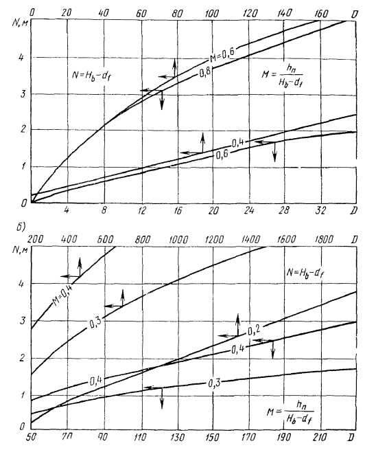 где P(Vнp) - заданная (нормативная) вероятность превышения объема наледи. Определив расчетные вероятности суммы жидких осадков и продолжительности морозного периода, по кривым обеспеченности находят расчетную сумму жидких осадков и продолжительность морозного периода. После этого по формулам (30) и (31) вычисляют переходные коэффициенты, затем по формулам (29), (19) и (20) - прогнозируемые объем наледи, ее среднюю и максимальную мощность. 3.23. Для расчетов сумм жидких осадков, продолжительности морозного периода и построения аппроксимирующих кривых обеспеченности разработана программа I СЕ 3 (Лед-III) для ЭВМ типа «Электроника-60». Программа I СЕ 3 (Лед-III) приведена в прил. 6. Пример прогнозирования расчетных параметров ключевой наледи приведен в прил. 7. Прогнозирование параметров наледей на потенциально наледных водотоках3.24. К этой группе относятся водотоки, на которых в период изысканий природные наледи не обнаружены, но по данным гидрогеологического и мерзлотно-геологического обследования в суровые зимы и после дождливой осени они могут развиваться. Строительство дорожных сооружений нарушает естественный водно-тепловой режим водотока. Во многих случаях это приводит к активизации наледного процесса. Наледи могут появиться там, где раньше их не было. 3.25. Определение расчетных параметров наледей на указанных водотоках может быть сделано одним из следующих способов. Необходимо тщательно обследовать берега и попытаться найти косвенные признаки образования наледи в предыдущие годы. Опросы старожилов и обследование растительности могут дать сведения о размерах наледи и давности ее образования. Определив уровень наледи, по рельефу местности можно приближенно определить ее размеры. Затем вероятностным методом переходных коэффициентов сделать прогноз ее параметров с необходимой вероятностью превышения. Если при обследовании водотока косвенные признаки границ наледи не обнаружены, а гидрогеологическое и мерзлотно-геологическое обследование водотока и намечаемые нарушения природных условий постройки сооружения показывают возможность образования наледи, то ее параметры могут быть приближенно определены методом гидравлических сопротивлений. 3.26. Расчетные толщины наледей поверхностных вод средняя и максимальная Zрн ср и Zрн max, вызванных нарушением естественных водно-тепловых условий водотока при строительстве и образующихся по схеме 1-а (рис. 4), могут быть определены по формулам: Zрн ср=g(DI+1,09rhc); (34) Zрн max=Y Zрн ср, (35) где g - коэффициент надежности, принимаемый равным 1,20; D - параметр, значения которого определяют по графикам (рис. 5) в зависимости от отношения величин hП/(НВ-df); HВ - глубина потока в начале ледостава; df - глубина промерзания выше стесненного участка; hП - глубина потока в зоне стеснения; I - уклон водотока; hс - толщина снега, м; r - плотность снега; Y - коэффициент формы наледи. 3.27. Расчетная толщина наледей грунтовых вод, вызванных нарушением естественных условий при строительстве и образующихся по схеме II-а (см. рис. 4), может быть определена по формуле ZГн ср=g(Z1+Z2+1,09rhc), (36) где Z1=0,88d' Z2=