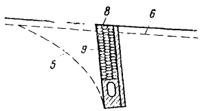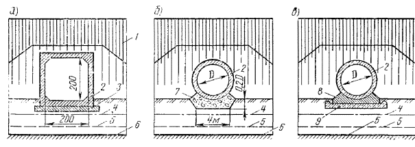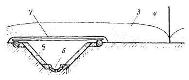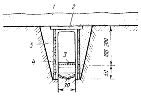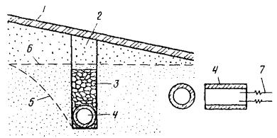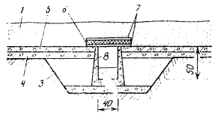 где где dfИ и df - глубина промерзания соответственно под фундаментом трубы при отсутствии теплоизоляционной подушки и с верховой стороны трубы в естественных условиях (определяются по формуле (24); hф - толщина плиты фундамента, м; lГР и lТП - коэффициенты теплопроводности соответственно мерзлого грунта и материала теплоизоляционной подушки, Вт/(м×°С); LГР и LТП - количество скрытой теплоты льдообразования соответственно в единице объема грунта и материала теплоизоляции, Дж/м3. Рис. 7. Конструкция труб на водотоках с наледями при благоприятных грунтовых условиях: а - прямоугольная труба на фундаменте из сборных плит; б - круглая на гравийно-песчаной подушка; г - круглая на фундаменте из лекальных железобетонных блоков с теплоизоляционной подушкой 1 - граница укрепления откоса; 2 - сборные звенья трубы; 3 - фундамент из сборных железобетонных плит; 4 - уровень грунтовых вод; 5 - граница сезонного промерзания; 6 - водоупор; 7 - гравийно-песчаная подушка; 8 - лекальные блоки фундамента; 9 - теплоизоляционная подушка Рис. 8. Конструкция круглой железобетонной трубы на однородном свайном основании: 1 - граница укрепления откоса; 2 - сборные звенья трубы длиной 2-3 м; 3 - железобетонная насадка; 4 - сваи на расстоянии, равном длине сборных звеньев трубы; 5 - верхняя граница многолетней мерзлоты; 6 - граница сезонного промерзания; 7 - уровень грунтовых вод Толщину теплоизоляционной подушки из искусственных материалов (пенопласта, полистирола) определяют из условия, что глубина промерзания под фундаментом трубы не более глубины промерзания в естественных условиях. При этом глубину промерзания под фундаментом определяют при термическом сопротивлении, вычисляемом по формуле,