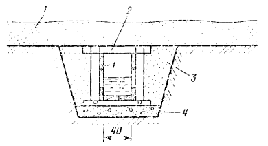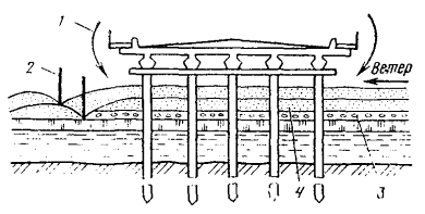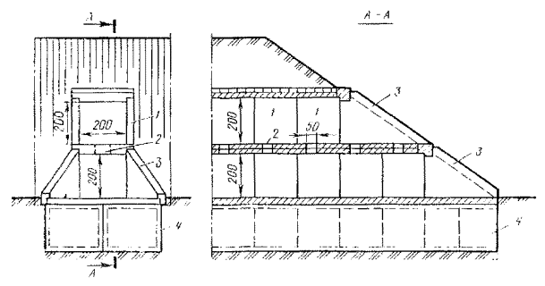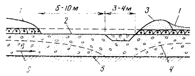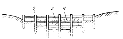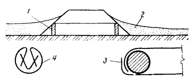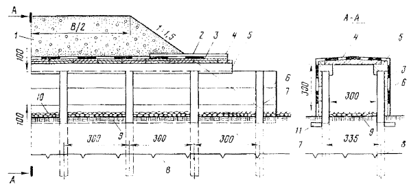 где hФ и lФ - соответственно толщина и коэффициент теплопроводности фундамента; НТП и lТП - толщина и коэффициент теплопроводности теплоизоляционной подушки. 4.2. При слабых и многолетнемерзлых грунтах в основании (сильно льдистых и пучинистых) могут быть применены круглые железобетонные трубы на однорядном свайном основании (рис. 8). При этой конструкции длинномерные звенья трубы (2- 3 м) опираются на фасонные насадки свай. Конструкция таких труб обеспечивает минимальное нарушение естественного мерзлотно-технологического режима водотоков. При аналогичных условиях и наледях несколько больших размеров в отдельных случаях может быть целесообразна свайно-щитовая труба конструкции Ленгипротранса (рис. 9). В глубоких логах и наледях большой толщины рациональна конструкция двухъярусной трубы, предложенная С.И. Гапеевым (рис. 10). Фундамент трубы состоит из железобетонных полых звеньев, заполняемых камнем и галькой. На фундаментные блоки в два яруса устанавливают прямоугольные блоки трубы и крылья оголовков. По высоте труба имеет два отверстия размеров 2´2 м. Между верхним и нижним ярусами в звеньях трубы делают отверстия размером 0,5´1,0 м. Если зимой образуется наледь толщиной 2,5-3,0 м и нижний ярус трубы окажется заполненным наледным льдом, это не опасно, так как остается свободной часть отверстия верхнего яруса. Когда начнется весенний сток, паводковые воды будут проходить через отверстия между ярусами трубы, и лед нижнего яруса будет подвергаться быстрому термоэрозионному разрушению. Рис. 9. Конструкция железобетонной свайно-щитовой трубы Ленгипротранса: 1 – насыпь; 2 - защитный слой цементного раствора; 3 – гидроизоляция; 4 - плита перекрытия; 5 - насадки (ригели); 6 - закладные плиты; 7 - сваи; 8 - верхняя граница многолетней мерзлоты; 9 - растительный мохо-торфяной слой; 10 - укрепление растительного слоя деревянным настилом, покрытым галькой и гравием; 11 - щебеночная подушка Рис. 10. Железобетонная двухъярусная труба для водотоков с наледями: 1 - железобетонные звенья трубы; 2 - отверстия в железобетонных звеньях размером 0,5´1,0 м; 3 - крылья оголовка; 4 - полые сборные звенья фундамента, заполняемые камнем и галькой Рис. 11. Железобетонная труба с фильтрующей насыпью: 1 - насыпь; 2 - дренирующий грунт; 3 - сборные звенья круглой трубы; 4 - фильтрующая насыпь 4.9. В районах с местными каменными материалами трубы на водотоках с наледями целесообразно строить в комплексе с фильтрующими насыпями. Нижнюю часть насыпи на высоту 1,0-1,5 м возводят из камня, над которой устанавливают трубу (рис. 11). Фильтрующая насыпь выполняет роль фундамента трубы и одновременно пропускает малые расходы. Труба, поднятая на высоту 1,0-1,5 м над дном лога, меньше подвержена затоплению наледью. Весной она обеспечивает пропуск максимального расхода, а затем большую часть года находится в сухом состоянии, что увеличивает ее долговечность. На суходолах с небольшими расходами и возможностью образования наледей малой толщины (не более 0,4 м) вместо труб допускается возводить фильтрующие насыпи (рис. 12). Рис. 12. Фильтрующая насыпь: 1 - грунт; 2 - каменная отсыпка 4.10. Отверстия искусственных сооружений на водотоках с наледями определяют расчетом на пропуск по поверхности наледи расчетного паводка. При гидравлическом расчете, отверстия не учитывают срезку и размыв, напорный и полунапорный режимы 