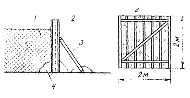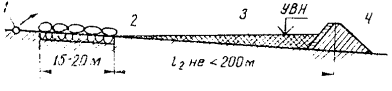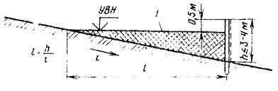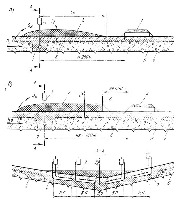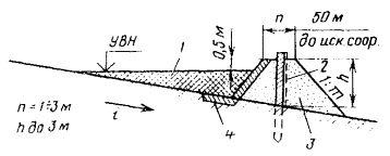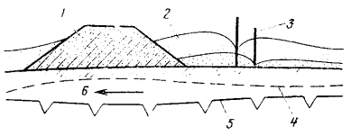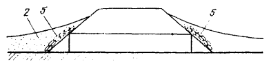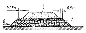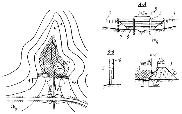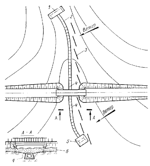 aM - коэффициент теплоотдачи от воды в воздух, при малых скоростях воздушного и водного потоков приближенно равный 30-40 Вт/(м2×°C); tГ - температура грунта в естественных условиях в наиболее холодный месяц на глубине заложения лотка; a2 - коэффициент теплоотдачи от воды к воздушной прослойке между перекрытием и водой, равный 30-40 Вт/(м2×°C); dСТ - толщина стенки, м; a3 - коэффициент теплоотдачи от воды к стенке лотка, зависящий от скорости течения в лотке и числа Рейнольдса, ориентировочно равный 4-5 Вт/(м2×°C); a4 - коэффициент теплоотдачи от стенки лотка в грунт (3-5 Вт/(м2×°C); lСТ - коэффициент теплопроводности материала стенки, Вт/(м2×°C) Формулы (49)-(55) позволяют при известных гидравлических и тепловых характеристиках потока и заданной конструкции лотка определить его длину, при которой возможен безналедный пропуск, или при заданной длине лотка обосновать его конструкцию и утепление. В прил. 8 приведен пример расчета безналедного пропуска водотока с применением закрытого утепленного лотка. Задержание наледей выше искусственных сооружений4.20. Задержание наледей выше искусственных сооружений применяют на водотоках с небольшими расходами наледеобразующей воды; когда посредством заграждений можно аккумулировать весь объем наледного льда, который образуется за зиму, или его большую часть. Это особенно целесообразно в районах с малым снежным покровом и низкой среднемесячной температурой воздуха наиболее холодного месяца. При этом методе наледеобразующий поток задерживается выше сооружения на безопасном расстоянии, и наледь формируется выше заграждения. Если наледеобразующая вода изливается на поверхность непосредственно у сооружения вследствие стеснения грунтового потока фундамента, тогда устраивают мерзлотные пояса и наледный процесс искусственно возбуждается выше сооружения на безопасном расстоянии. Для задержания наледей выше сооружений в зависимости от конкретных условий применяют различные противоналедные сооружения и устройства. 4.21. Грунтовые валы (табл. 5, п. 1) применяют как постоянные противоналедные сооружения для задержания наледей различных размеров, а также для направленного регулирования стока наледеобразующей воды. Их следует возводить из слабодренирующих грунтов с предварительным удалением растительного слоя в основании и послойным уплотнением отсыпаемого грунта. При отсутствии слабодренирующих грунтов валы можно возводить из гравийно-песчаных грунтов. Во избежание интенсивной фильтрации через вал наледеобразующей воды в его теле необходимо устраивать противофильтрационную диафрагму. Для диафрагм можно применять стабилизированную полиэтиленовую пленку толщиной 0,2-0,4 мм. Морозостойкость такой пленки составляет -70°C, а прочность на разрыв 12 МПа. Пленку следует укладывать без натяжения с волнистостью. 4.22. Над руслом водотока в грунтовом теле следует оставлять проем длиной не менее отверстия искусственного сооружения для пропуска весенних и ливневых вод. На зимний период проем закрывают сборно-разборным забором или щитами. Откосы валов с верховой стороны необходимо укреплять посевом трав или каменной наброской. Особенно хорошо должны быть укреплены конуса вала в проеме, где они часто подвергаются размывам весенними и летними паводками. Тип крепления для них выбирают в зависимости от скорости течения 