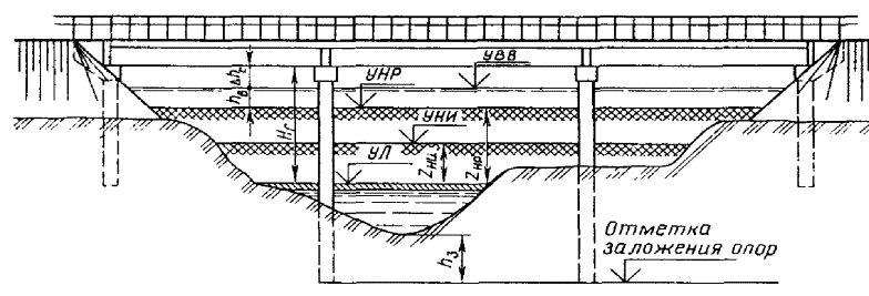 где hфi и hф(i+1) - ординаты толщины фильтрационной зоны в точках перелома профиля подземного контура фильтрации (расстояния от уровня сезонного промерзания в бытовых условиях до водоупора); аi - расстояния между точками перелома профиля фильтрационной зоны. Рис 2. Кривые обеспеченности сумм жидких осадков и глубин промерзания на водотоке А (смешанное питание) При определении площади стеснения постройкой мостов учитывают стеснение опорами с намерзающим вокруг них грунтом и слоем дополнительного промерзания под пролетами моста, так как под мостами обычно снежного покрова не бывает. При принятых на рис. 3 обозначениях площадь стеснения wс=nоп(b+2b1)(d-df)+(d'f-df)(l-2b1)nпр, (18) где nоп и nпр - соответственно количество опор и пролетов моста; b и b1 - соответственно ширина опоры и толщина намерзшего вокруг опоры слоя грунта (табл. 3); df и d'f - глубина сезонного промерзания соответственно на водотоке и под мостом; d - глубина заложения опор; l - длина пролетов моста в свету между опорами. При стеснении фильтрационного потока опорами моста или фундаментом трубы часть потока отжимается в соседние зоны фильтрации на поймах. Ширину фильтрационной зоны можно принимать равной расстоянию между точками смыкания границы сезонного промерзания с водоупором, но не более: для мостов 10L при L до 20 м и 5L при L более 20 м; для труб 10D, где L и D - длина отверстий соответственно моста и трубы. Определив переходные коэффициенты kx, kf и kc по формуле (6), определяют объем наледи с заданной вероятностью превышения. 3.8. При проектировании искусственных сооружений наибольшее значение имеет толщина наледи, так как от нее зависит необходимая высота отверстия и пойменных насыпей. Зная объем наледи с заданной вероятностью превышения, объем и среднюю толщину наледи в год изысканий, можно определить среднюю расчетную толщину наледи по наледной поляне где Zcpp и Zcpи - средняя толщина наледи по наледной поляне соответственно расчетная и в год изысканий; Vнр и VНИ - объем наледи соответственно расчетный с нормативной (заданной) вероятностью превышения и в год изысканий. После постройки искусственного сооружения с небольшим отверстием место с максимальной толщиной наледи часто располагается у сооружения, поэтому отверстия искусственных сооружений необходимо проектировать по максимальной расчетной толщине наледи, которую определяют по формуле Zmax p=YZcp p, (20) где Y - коэффициент формы наледи, определяемый при ледомерной съемке по формуле (5); Zcp р - средняя толщина по наледной поляне. Рис. 3. Схема стеснения фильтрационного потока постройкой моста: 1 - поверхность земли; 2 - осенний уровень грунтовых вод; 3 - граница сезонного промерзания в бытовых условиях; 4 - то же, под пролетами моста; 5 - граница намерзания грунта вокруг опор; 6 - водоупор (ВФЗ - ширина фильтрационной зоны) Таблица 3. Толщина намерзания грунта вокруг опор b1 в зависимости от продолжительности морозного периода, средней температуры воздуха, ширины опоры b и глубины от поверхности х