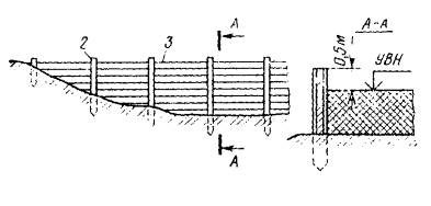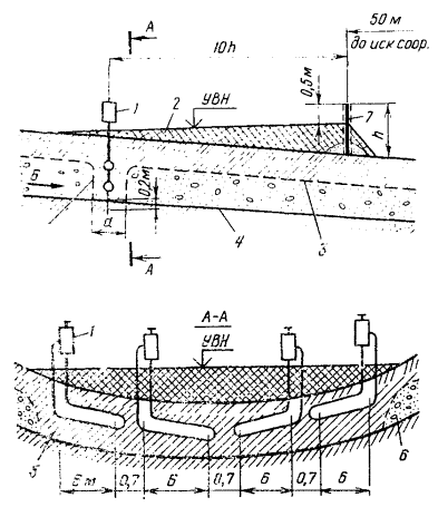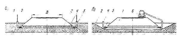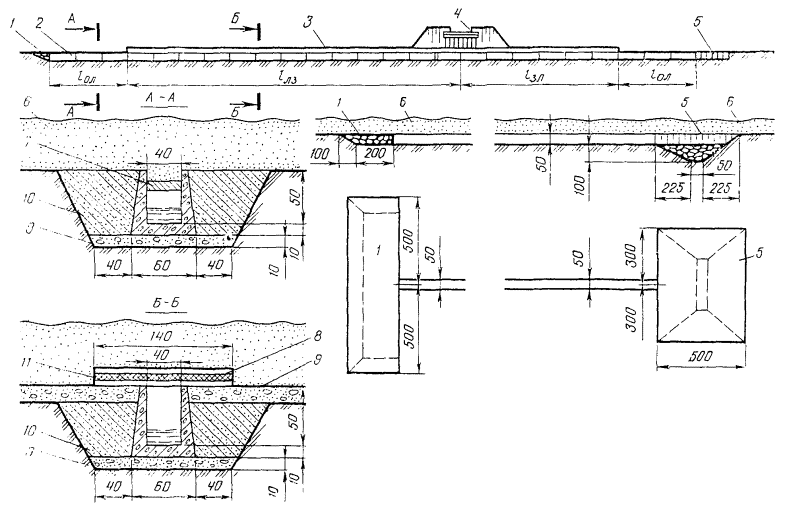 6.5. На некоторых водотоках с благоприятным рельефом берегов можно производить подпруживание водотоков (табл. 4, п. 6). При этом надо следить за толщиной намерзания льда и частично опускать воду из запруды, чтобы образовались две-три воздушно-ледяные прослойки по 5-7 см. 6.6. Для отвода ключевых и неглубоко залегающих грунтовых вод, а также для осушения местности могут применяться различные водоотводные канавы: открытые (табл. 4, п. 7), утепленные, покрытые хворостом и снегом (табл. 4, п. 8, а), утепленные, покрытые пленкой и снегам (табл. 4, п. 8, б). Утепленные деревянные и железобетонные водоотводные лотки (табл. 4, п. 9, а, б) в конце осени следует закрывать и утеплять, а после прохода весеннего паводка открывать и очищать от наносов. Для перехвата и отвода грунтовых вод глубокого залегания могут быть применены глубокие дренажные лотки (табл. 4, п. 10) и закрытые глубокие дренажи с трубофильтрами (табл. 4, п. 11, а) или из экранных плит фильтрационного бетона (табл. 4, п. 11, б). 6.7. При борьбе с наледями по принципу их задержания на безопасном расстоянии от сооружения применяют противоналедные сооружения и устройства, указанные в табл. 5. Когда возникает опасность затопления наледью дороги или закупорки отверстия искусственного сооружения, в необходимых местах делают снежно-ледяные валы и в наледном льду прорубают канавы для отвода воды в безопасное для сооружения место. Снежно-ледяные валы делают высотой 0,5-0,8 м из уплотненного снега, облитого водой для создания ледяной водонепроницаемой корки. Когда уровень наледи достигает вершины вала, устраивают снежно-ледяной вал второго яруса. Для борьбы с растекающейся наледеобразующей водой вместо снежно-ледяных валов рациональнее применять противоналедные щиты (табл. 5, п. 3, а, б). Однако перечисленные мероприятия временные, и должен решаться вопрос о постройке постоянных удерживающих устройств или других способах борьбы. К следующему зимнему сезону на месте снежно-ледяного вала может быть сделан постоянный грунтовый вал (табл. 5, п. 1) или противоналедный забор (табл. 5, п. 2, а, б, в). 6.8. С целью повышения интенсивности охлаждения наледеобразующей воды и ускорения перехода ее в лед можно устраивать наледные пояса. Они представляют собой расчищенную от растительности площадку с каменной наброской (табл. 5, п. 4), на которой поток наледеобразующей воды распластывается тонким слоем, разделяется на мелкие струи, теряет скорость и охлаждается быстрее. 6.9. Когда наледи изливаются на поверхность вблизи сооружений, место их образования можно перенести вверх по водотоку или склону. Для этого устраивают сезонные мерзлотные пояса (табл. 5, п. 5, а, б). Их располагают поперек водотока или вдоль склона, расчищают от снега полосу шириной 5-10 м, вырубают во льду или грунте канаву и делают снежно-ледяной вал. При промерзании создается мерзлотная перемычка, грунтовые или речные воды изливаются на поверхность выше пояса и по канаве отводятся в безопасное место. Постоянные мерзлотные пояса грунтовые (табл. 5, п. 5, в) и с охлаждающими установками (табл. 5, п. 5, г) устраивают при строительстве дороги. Однако в процессе эксплуатации сооружений и изучения особенностей развития наледей может возникнуть необходимость устройства дополнительных мерзлотных поясов. Их целесообразно делать осенью при низком уровне грунтовых вод. 6.10. В течение зимы н