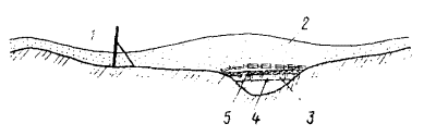 Принимает толщину прокладки пенопласта равной 3 см. Кроме крышки, лоток утепляем снегом. Для этого осенью с наветренной стороны по водотоку устанавливаются снегозадерживающие щиты, а отверстия трубы с обеих сторон закрываются щитами из арматурного каркаса и полиэтиленовой пленки. ПРИЛОЖЕНИЕ 9Пример расчета двухтрубной охлаждающей установки для создания противоналедных мерзлотных поясов у искусственных сооруженийОхлаждающие установки проектируются двухтрубные, изогнутые с использованием в качестве теплоносителя керосина. Подземная часть установки имеет длину по горизонтали 6,0 м. Трубы имеют диаметры 80 и 110 мм. В земле верхняя труба залегает на глубине 60 см, нижняя на глубине 110 см и расположена на 25 см выше водоупора (рис. 1). Холодопроизводительность установки определяется по экспериментально-теоретической формуле Q=24Stt[VK-VK(tКH-tKP)b]qYk1k2, где 24Stt - период работы охлаждающей установки зимой, °С×с; VK - объем керосина, м3; tКH - температура керосина при заполнении охлаждающей установки, °С; tКP - средняя пониженная температура керосина, характеризующая объем его в холодный расчетный период, °С; b - коэффициент объемного изменения керосина при охлаждении; Y - коэффициент, учитывающий изменения удельной поверхности охлаждения керосина в трубах по сравнению с опытной установкой; k1 - коэффициент, учитывающий влияние ветра, принимаем равным