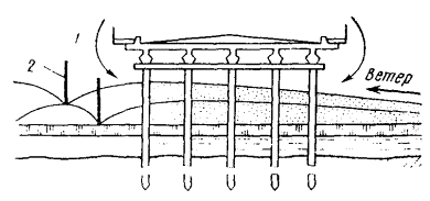 для определения параметра D при Если перед ледоставом на водотоке наблюдается поверхностный сток, параметры наледи смешанных вод могут быть определены по формулам: Zсн ср= Zрн ср+ZГн ср; (43) Zсн max=YZсн ср. (44) 4. ПРОЕКТИРОВАНИЕ ИСКУССТВЕННЫХ СООРУЖЕНИЙ НА ВОДОТОКАХ С НАЛЕДЯМИПринципы проектирования и типы сооружений4.1. На водотоках с наледями искусственные сооружения должны быть запроектированы так, чтобы наледи не оказывали на них вредных воздействий и не создавали затруднений при эксплуатации в течение всего срока службы. Это достигается применением рациональных типов и размеров сооружений, максимальным сохранением на переходе природных условий, организацией зимнего стока, строительством противоналедных сооружений и проведением мероприятий по борьбе с наледями в период эксплуатации. Искусственные сооружения на водотоках с наледями проектируют на основе данных инженерно-геологического обследования водотоков и прогнозирования наледных процессов. При прогнозировании определяют расчетные параметры наледей, по которым с учетом пропуска паводковых вод назначают размеры отверстий искусственных сооружений. 4.2. На водотоках с наледями можно проектировать следующие тины искусственных сооружений: 1) мосты на свайных и столбчатых опорах; 2) прямоугольные и круглые трубы; 3) трубы с постоянными противоналедными устройствами; 4) трубы с фильтрующими насыпями. Выбор типа искусственного сооружения зависит от водности водотока, мерзлотно-грунтовых и гидрогеологических условий, размеров наледи, характера ее действия и принятого принципа проектирования. 4.3. Применяемые на водотоках с наледями тины искусственных сооружений не должны вносить больших нарушений в естественный водно-тепловой режим водотока. Чтобы не вызвать активизацию наледного процесса, стеснение подруслового потока фундаментами сооружений должно быть минимальным и на месте перехода необходимо максимально сохранять естественные природные условия. Совершенно недопустимо на водотоках с наледями применять опоры мостов и водопропускные трубы с массивными фундаментами, которые значительно стесняют площадь фильтрации подрусловых вод, нарушают режим грунтового потока и приводят к активизации наледного процесса. 4.4. Рациональными типами опор мостов на водотоках с наледями являются свайные и из свай-столбов (рис. 6). Такие опоры мало стесняют фильтрационный порусловый поток и не вносят больших нарушений в его режим. Рис. 6. Конструкция свайно-эстакадных мостов на водотоках с наледями: а - фасад моста; б - опора с вертикальными сваями; в - опора на двух вертикальных сваях-столбах; г - то же, на двух наклонных сваях-столбах; д - одностолбчатая опора; 1 - уровень ледостава; 2 - отметка заложения опор Опоры могут быть из ряда вертикальных свай (рис. 6, б) или из двух свай-столбов вертикальных (рис. 6, в) или наклонных (рис. 6, г). Наклонные сваи-столбы целесообразно применять при опасности деформаций от воздействия наледных бугров или морозного пучения грунтов. При таких условиях рациональны также одностолбчатые опоры (рис. 6, д), у которых большая постоянная нагрузка на столб, что увеличивает их устойчивость при пучении. 4.5. Водопропускные трубы можно проектировать на водотоках с небольшими наледями, когда их прогнозируемая толщина с расчетной обеспеченностью не превышает 2/3 высот