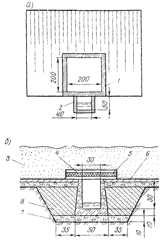 откуда tВОЗ= -13,2°С. Определяем толщину теплоизоляции перекрытия. Крышку лотка в русле водотока делаем из двух слоев досок толщиной по 4 см с прокладкой между ними слоя пенопласта. Коэффициент температуропроводности пенопласта а=0,00043 м2/ч. Рис. 1. Безналедный пропуск водотока у прямоугольной трубы: а - поперечный разрез трубы и лотка; б - конструкция утепленного лотка в русле водотока 1 - железобетонная прямоугольная труба; 2 - железобетонный лоток; 3 - снег; 4 - пенопласт; 5 - доски 4 см; 6 - укрепление русла; 7 - гравий с песком; 8 - местный грунт Определяем коэффициент для пользования графиком на рис. 16: аt=0,00043×720=0,31; m0=tПР:tВОЗ=13,2:24,6=0,535. По графику на рис. 16 находим, что общая толщина теплоизоляции из дерева составляет 0,23 м. Но крышку лотка делаем из двух слоев досок по 4 см, а между ними укладываем прокладку из пенопласта. Необходимая толщина прокладки пенопласта будет