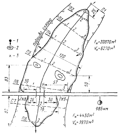 Рис. 1. План наледи: 1 - место выхода наледной воды; 2 - наледные бугры; 3 - перекат