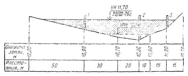 Рис. 3. Поперечный профиль наледи: 1, 2, 3 - ледомерные рейки Динамика развития наледи Изливы наледеобразующей воды