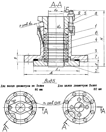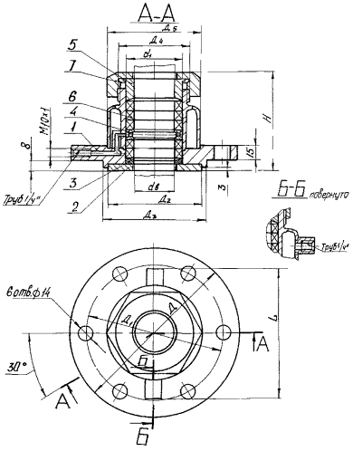 (Измененная редакция, Изм. № 1). *Не указано исполнение уплотнения по материалу Пример условного обозначения сальникового уплотнения с автоматическим поджимом набивки, с охлаждением корпуса и подводом циркулирующей жидкости к валу диаметром 40 мм и исполнением опорного кольца поз.2 из: Стали Вст3сп5 по ГОСТ 380-71 Сальник IVБ40-У ОСТ 26-01-1247; Стали 12Х18Н10Т по ГОСТ 5632-72 Сальник IVБ40-К ОСТ 26-01-1247; Стали 10Х17Н13М2Т по ГОСТ 5632-72 Сальник IVБ40-КЕ ОСТ 26-01-1247; Сплава 06ХН28МДТ по ГОСТ 5632-72 Сальник IVБ40-КН ОСТ 26-01-1247; Титана ВТ1-0 по ОСТ 1-90013-81 Сальник IVБ40-Т ОСТ 26-01-12477-75. Сальниковые уплотнения типа VА 1 - корпус; 2 - кольцо опорное; 3 - кольцо; 4 - фонарь; 5 - втулка нажимная; 6 - набивка; 7 - гайка Черт. 5 Таблица 6 Основные размеры, мм