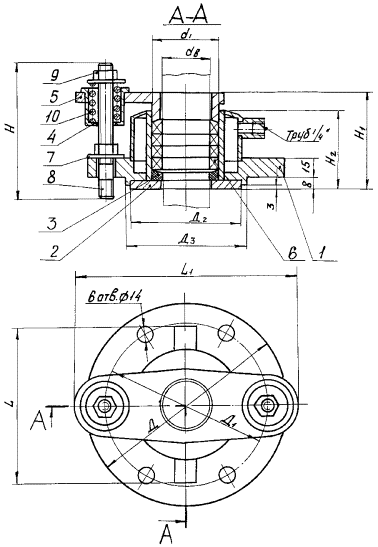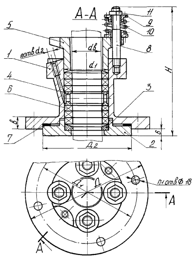 (Измененная редакция, Изм. № 1). *Не указано исполнение уплотнения по материалу. Пример условного обозначения сальникового уплотнения на вал 25 мм без автоматического поджима набивки и исполнением опорного кольца поз.2 из: Стали Вст3сп5 по ГОСТ 380-71 Сальник VА25 ОСТ 26-01-1247; Стали 12Х18Н10Т по ГОСТ 5632-72 Сальник VА25-К ОСТ 26-01-1247; Стали 10Х17Н13М2Т по ГОСТ 5632-72 Сальник VА25-КЕ ОСТ 26-01-1247; Сплава 06ХН28МДТ по ГОСТ 5632-72 Сальник VА25-КН ОСТ 26-01-1247; Титана ВТ1-0 по ОСТ 1-90013-81 Сальник VА25-Т ОСТ 26-01-1247. Сальниковые уплотнения типа VБ 1 - корпус; 2 - кольцо опорное; 3 - кольцо; 4 - стакан; 5 - втулка нажимная; 6 - набивка; 7 - шайба 8 - шпилька; 9 - гайка; 10 - пружина. Черт. 6 Таблица 7 Основные размеры, мм