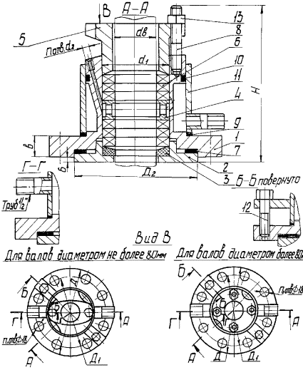 (Измененная редакция, Изм. № 1). *Не указано исполнение уплотнения по материалу. Пример условного обозначения сальникового уплотнения с автоматическим поджимом набивки, подводом циркулирующей жидкости к валу диаметром 40 мм и исполнением опорного кольца поз. 2 из: Стали Вст3сп5 по ГОСТ 380-71 Сальник IIБ40-У ОСТ 26-01-1247; Стали 12Х18Н10Т по ГОСТ 5632-72 Сальник IIБ40-К ОСТ 26-01-1247; Стали 10Х17Н13М2Т по ГОСТ 5632-72 Сальник IIБ40-КЕ ОСТ 26-01-1247; Сплава 06ХН28М2Т по ГОСТ 5632-72 Сальник IIБ40-КН ОСТ 26-01-1247; Титана ВТ1-0 по ОСТ 1-90013-81 Сальник IIБ40-Т ОСТ 26-01-1247. Сальниковые уплотнения типов IIIА и IVА 1 - корпус; 2 - кольцо опорное; 3 - кольцо; 4 - фонарь; 5 - втулка нажимная; 6 - набивка; 7 - прокладка; 8 - шпилька; 9 - прокладка; 10 - кольцо уплотнительное; 11 - рубашка; 12 - болт; 13 - гайка Черт. 3 Таблица 4 Основные размеры, мм