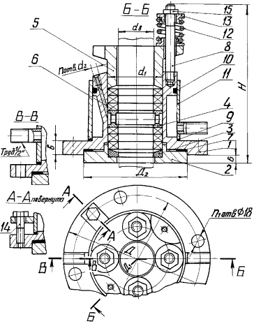 (Измененная редакция, Изм. № 1). *Не указано исполнение уплотнения по материалу. Пример условного обозначения сальникового уплотнения без автоматического поджима набивки с охлаждением корпуса и подводом смазки к валу диаметром 40 мм и исполнением опорного кольца поз. 2 из: Стали Вст3сп5 по ГОСТ 380-71 Сальник IIIА40-У ОСТ 26-01-1247; Стали 12Х18Н10Т по ГОСТ 5632-72 Сальник IIIА40-К ОСТ 26-01-1247; Стали 10Х17Н13М2Т по ГОСТ 5632-72 Сальник IIIА40-КЕ ОСТ 26-01-1247; Сплава 06ХН28МДТ по ГОСТ 5632-72 Сальник IIIА40-КН ОСТ 26-01-1247; Титана ВТ1-0 по ОСТ 1-90013-81 Сальник IIIА40-Т ОСТ 26-01-1247. Сальниковые уплотнения типов IIIБ и IVБ 1 - корпус; 2 - кольцо опорное; 3 - кольцо; 4 - фонарь; 5 - втулка нажимная; 6 - набивка; 7 - прокладка; 8 - шпилька; 9 - прокладка; 10 - кольцо уплотнительное; 11 - рубашка; 12 - пружина; 13 - тарелка; 14 - болт; 15 - гайка Черт. 4 Таблица 5 Основные размеры, мм