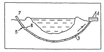 Этап 3. Протаскивание трубопровода за расширителем к буровой установке Этап 4. Гидравлическое испытание трубопровода в скважине Обозначения: 1 - буровая головка с забойным двигателем; 2 - бурильная колонна труб;-3 - вторая бурильная колонна труб; 4 - буровая установка; 5 - вертлюг; 6 - расширитель; 7 - трубопровод; 8 - цилиндрический расширитель