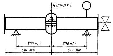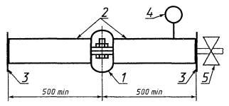 4.11 Результаты испытаний считают удовлетворительными, если каждая из предъявленных к испытаниям муфт соответствует требованиям настоящего стандарта по 4.10. 4.12 В случае получения отрицательных результатов по какому-либо виду испытаний количество испытуемых образцов удваивают и испытания повторяют в полном объеме. Полученные повторно результаты считают окончательными. 5 Методы испытаний5.1 Все испытания, если это не оговорено в методах испытаний или в технических документах на муфту, следует проводить при нормальных климатических условиях регламентированными ГОСТ 15150. 5.2 Соответствие муфт требованиям 3.1 проверяют визуально. 5.3 При проверке муфт на соответствие техническим документам (3.2) линейные размеры определяют с помощью линейки с ценой деления 1 мм по ГОСТ 427 и штангенциркуля с ценой деления 0,1 мм по ГОСТ 166. 5.4 Соответствие окраски корпуса и покрытия элементов крепления (3.3, 3.4) проверяют визуально. 5.5 При испытании муфт на устойчивость к климатическим воздействиям (3.5) проверяют их устойчивость к холоду и теплу при минимальном и максимальном значениях температуры эксплуатации. Муфты выдерживают при соответствующей минимальной температуре в течение не менее 3 ч. После испытания муфты помещают в нормальные климатические условия по ГОСТ 15150 не менее чем на 3 ч. Затем муфты выдерживают при соответствующей максимальной температуре в течение не менее 3 ч. После испытания муфты помещают в нормальные климатические условия по ГОСТ 15150 не менее чем на 3 ч. Результаты испытаний считают положительными, если после всего цикла испытаний муфты удовлетворяют требованиям 3.7 - 3.12. 5.6 Испытания муфт на виброустойчивость (3.6), герметичность (3.7, 3.8), вакуум (3.9), нагрузку (3.10), устойчивость к гидроудару (3.11), пробное гидравлическое давление (3.12) проводят в составе опытной сборки (рисунок 1). Опытная сборка (рисунок 1) должна состоять из двух, соединенных муфтой 7, трубопроводов 2, соответствующих своими параметрами и присоединительными размерами техническим документам на муфту, с заглушками 3 и должна быть оборудована манометром (вакуумметром) 4 и запорным устройством 5. 1 - муфта; 2 - трубопровод; 3 - заглушка; 4 - манометр (вакуумметр); 5 - запорное устройство Рисунок 1 5.7 Испытание муфт на виброустойчивость (3.6) проводят на вибростенде, обеспечивающем получение в контрольной точке стенда синусоидальной вибрации от 5 до 40 Гц с амплитудой ускорения 4 м/с2. Опытную сборку крепят к подвижной платформе стенда в горизонтальном положении, предварительно создав в ней гидравлическое давление (1,2 ± 0,05) МПа. Вибровоздействие проводят при непрерывном изменении частоты от (5 ± 1) до (40 ± 1) Гц и обратно при темпе не более 5 мин/октава и амплитуде ускорения 4 м/с2 в течение 1 ч. Критерием отказа является появление течи в муфтовом соединении и падение давления более 0,05 МПа. 5.8 Герметичность муфтового соединения по 3.7 проверяют созданием в опытной сборке гидравлического давления (1,2 ± 0,05) МПа в течение не менее 5 мин. Скорость нарастания давления - не более 0,1 МПа /с. Критерием отказа является появление течи в муфтовом соединении и падение давления более 0,05 МПа. 5.9 Герметичность муфтового соединения по 3.8 проверяют созданием в опытной сборке пневматического давления (0,3 ± 0,01) МПа в течение не менее 5 мин. При этом опытную сборку полностью погружают в воду. Скорость нарастания давления - н