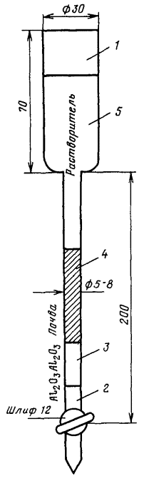 Предварительную очистку выделенных нефтепродуктов от примесей, мешающих определению соединений, проводят хроматографическими методами (в тонком слое, на бумаге, в колонке). Наиболее точными и универсальными методами являются газожидкостная хроматография или инфракрасная спектроскопия. Предлагаемая методика определения нефтепродуктов в почве основана на экстракции нефтепродуктов из почвы четыреххлористым углеродом с одновременной очисткой элюатов на окиси алюминия в колонке. Концентрации углеводородов в пробе определяются ИК спектрометрическим методом (ИКС). ИКС метод основан на измерении интенсивности С-Н-связей: метиленовых - СН2 и метильных - CH3 групп в области 2700-3100 см-1. Количественное определение нефтепродуктов проводят по калибровочным графикам, полученным на основании искусственной смеси углеводородов. Для определения содержания битумонозных веществ в объектах окружающей среды используется люминесцентный метод, который базируется на пропорциональной зависимости между концентрацией люминесцирующего вещества и интенсивностью люминесценции в области малых концентраций. При этом репрезентативность метода целиком зависит от правильности подбора эталонов. Чувствительность ИКС метода определения нефтепродуктов в почве составляет 0,02 г/кг воздушно-сухой навески. IV.6.2. Реактивы Алюминий окись (Аl2O3) безводный ч., МРТУ 6-09-5296-68. Перед употреблением реактив активируют прокаливанием при t=600±10 °С в течение 4 ч. Углерод четыреххлористый осч., МРТУ 6-09-2666-65. Проверяют чистоту каждой партии на примеси органических соединений (наличие поглощения в области 2700-3100 см-1) относительно четыреххлористого углерода, перегнанного при 76,6±0,2 °С и пропущенного через колонку с активированной окисью алюминия. При наличии примесей реактив перегоняют при 76,6±0,2 °С. Изооктан (С8Н18) х.ч., ТУ 6П-8-68. Гексадекан (С16H34) х.ч., МРТУ 6-09-461467. Бензол (С6Н6) х.ч., ГОСТ 5955-68. Кальций хлористый ч., ГОСТ 4460-66. Вата, промытая четыреххлористым углеродом. IV.6.3. Приборы и посуда Аналитические весы (ВЛР-200, АДВ-200 и т.д.). Инфракрасный спектрометр типа ИКС-14, ИР-20, ИКС-2 и т.д. Неразборные и разборные кюветы с окошками из кристаллов NaCl, стеклянные цилиндры (от спектрофотометра СФ-16 или СФ-4) и держатели для соответствующих кювет к ИК спектрометру. Пробирки стеклянные, ГОСТ ПКСШ 14,5-20. Хроматографическая колонка с внутренним диаметром 0,5-0,8 мм (рис. IV.6.1). Штатив для колонок (рис. IV.6.2). Цилиндры мерные объемом 50, 100 мл, ГОСТ 8682-70. Стаканы мерные объемом 50, 100 мл, Н-50, Н-100 ТС, ГОСТ 10394-72. Колбы мерные объемом 100 мл 4-100-2, ГОСТ 1770-74. Пипетки па 1 мл 4-1-1, ГОСТ 20292-74. Пипетки на 5 мл 7-1-5, ГОСТ 20292-74. Сушильный шкаф Т-3. Аппарат для перегонки растворителя. Фарфоровая ступка с пестиком, ГОСТ 9147-73. Мешки из плотной ткани для хранения проб. Сито с диаметром отверстий 0,50 мм, ТУ 46-47 885-73. Электрическая плитка ТУ 92-288-74. IV.6.4. Подготовка образцов к анализу Из почвенных образцов в воздушно-сухом состоянии отбирают посторонние включения. Средние пробы образцов весом 30 г, подлежащие анализу, растирают в фарфоровой ступке и просеивают через сито 0,50 мм. Пробу квартуют и отбирают для анализа две параллельные пробы по 3-5 г. Если в пробе заведомо много нефтепродуктов, берут навеску 0,5-1,0 г (табл. IV.6.1). IV.6.5. Проведение определения IV.6.5.1. Предварительные указания. На точность определения нефтепродуктов в большой степени влияет чистота 