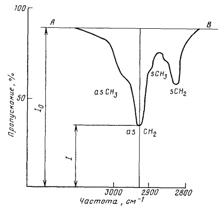 IV.6.6. ИК спектрометрический анализ экстрактов IV.6.6.1. Приготовление стандартных растворов и построение калибровочных кривых. Для построения калибровочной кривой в качестве стандартного раствора используют смесь, состоящую из 2,5 мл изооктана, 5,0 мл н-гексадекана и 2,5 мл бензола; систематическая ошибка при этом не превышает 1,0 %. Полученную смесь растворяют в ССl4, в мерной колбе на 100 мл. Концентрация полученного раствора 77,8±0,8 мг/мл (раствор А). Из раствора А готовят два рабочих раствора Б. По 1,0 мл раствора (А) разбавляют в мерных колбах на 25 мл (раствор Б1) и на 100 мл (раствор Б2). Растворы Б1 и Б2 содержат 3,10±0,03 и 0,80±0,01 мг/мл соответственно и служат основными стандартными растворами. Две серии стандартных растворов с концентрациями 3,10; 0,60; 0,40; 0,20 и 0,10 мг/мл готовят последовательным разбавлением соответствующих основных растворов Б1 и Б2 четыреххлористым углеродом. Одну кювету заполняют ССl4, предварительно пропущенным через колонку с окисью алюминия (кювета сравнения), другую - исследуемым раствором. Измеряют интенсивность поглощения каждого раствора на инфракрасном спектрометре в интервале длин волн 2700-3100 см-1. Измерения проводят в неразборных или разборных кюветах (для концентрации нефтепродуктов ниже 1,0 г/кг). Разборные кюветы состоят из двух окошек из кристаллов NaCl (прилагаются к спектрометру) и стеклянного цилиндра длиной 10 мм (прилагается к спектрофотометру СФ-4А(СФ-16) или можно вырезать из тефлона). Оптическую плотность рассчитывают методом базисной линии. Последнюю проводят как касательную к основанию двух пиков, соответствующих симметричным и асимметричным валентным колебаниям СН2 и СН3 групп, как показано на рис. IV.6.3. Анализ ведут по полосе поглощения асимметричных валентных колебаний метиленовых групп (2926 см-1) либо по сумме оптических плотностей двух или трех длин волн [8]. На регистрирующей ленте указывают дату анализа, маркировку пробы, толщину кюветы и объем элюата. Оптическую плотность вычисляют по формуле E=lg I0/I, (IV.6.1) где I0, I - интенсивность падающего и прошедшего через раствор излучения. При анализе нефтепродуктов по одной длине волны I измеряют в максимуме поглощения полосы aS - СН2 n=2926 см-1; I0 - интенсивность потока в отсутствие поглощения. Далее строят калибровочные графики, откладывая по оси ординат оптическую плотность, по оси абсцисс - концентрацию нефтепродуктов (мг/мл) в пробе. Вид калибровочного графика изображен на рис. IV.6.4. Все стандартные растворы необходимо хранить только в стеклянной посуде с притертыми пробками при комнатной температуре в вытяжном шкафу. IV.6.6.2. Обработка результатов анализа. Содержание (г/кг) нефтепродуктов в пробе (Х) при ИКС аналитическом окончании определяют по формуле (IV.5.1)